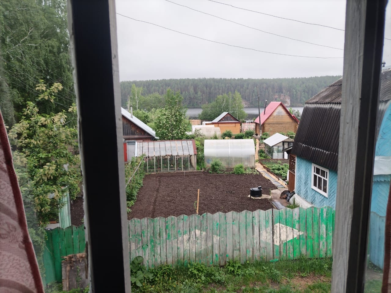 На участке построен дом с мансардой, из окна которой открывается прекрасный вид на реку.