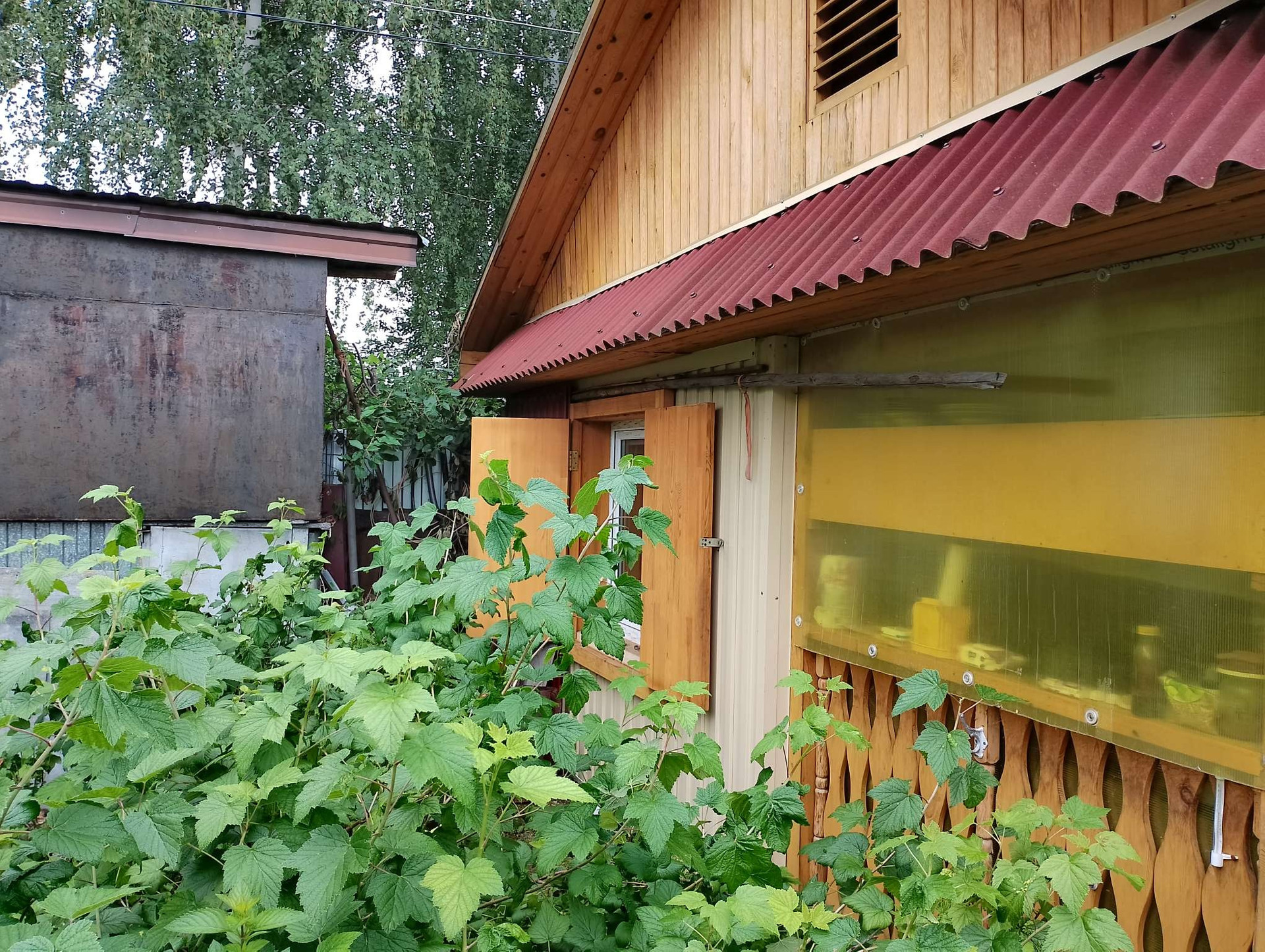 На участке много различных насаждений: малина крыжовник, красная и белая смородина, вишня, ирга, яблони, клубника, кабачки, огурцы, томаты, лук, чеснок, горох, бобы, свекла, морковь и др.
