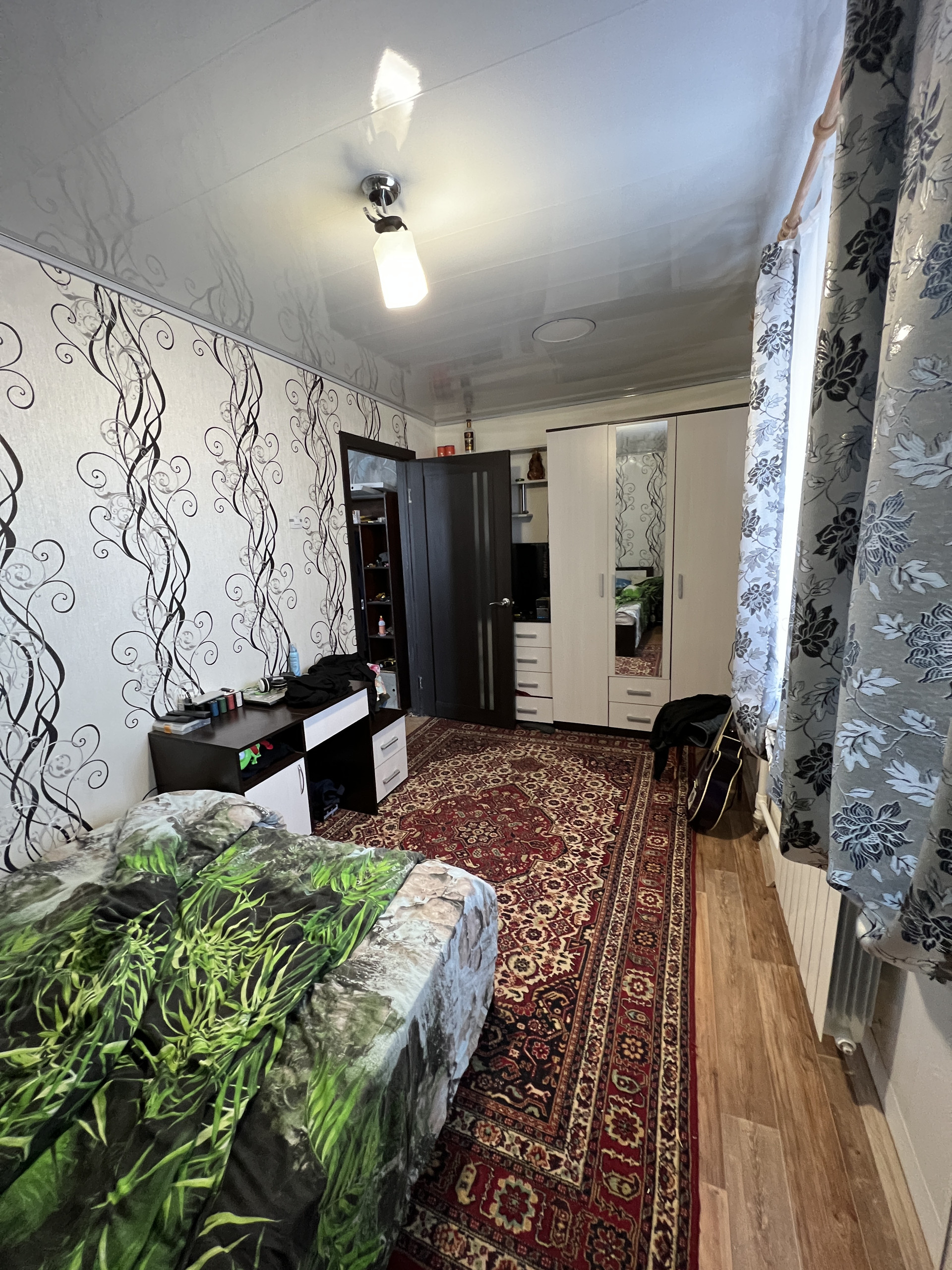 Рядом находится школа, детский сад, детская площадка. Недалеко от больничного городка, автовокзал. До центра идти 10-15 минут. Без мебели, только старый шкаф. Балкон застекленный.