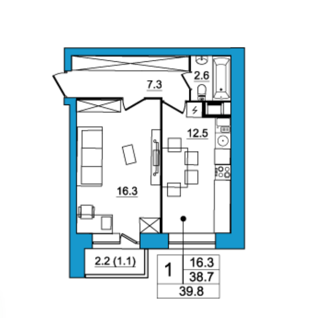 Общая площадь 38.7 м2