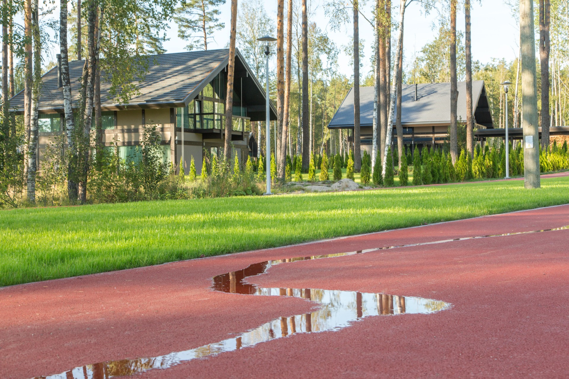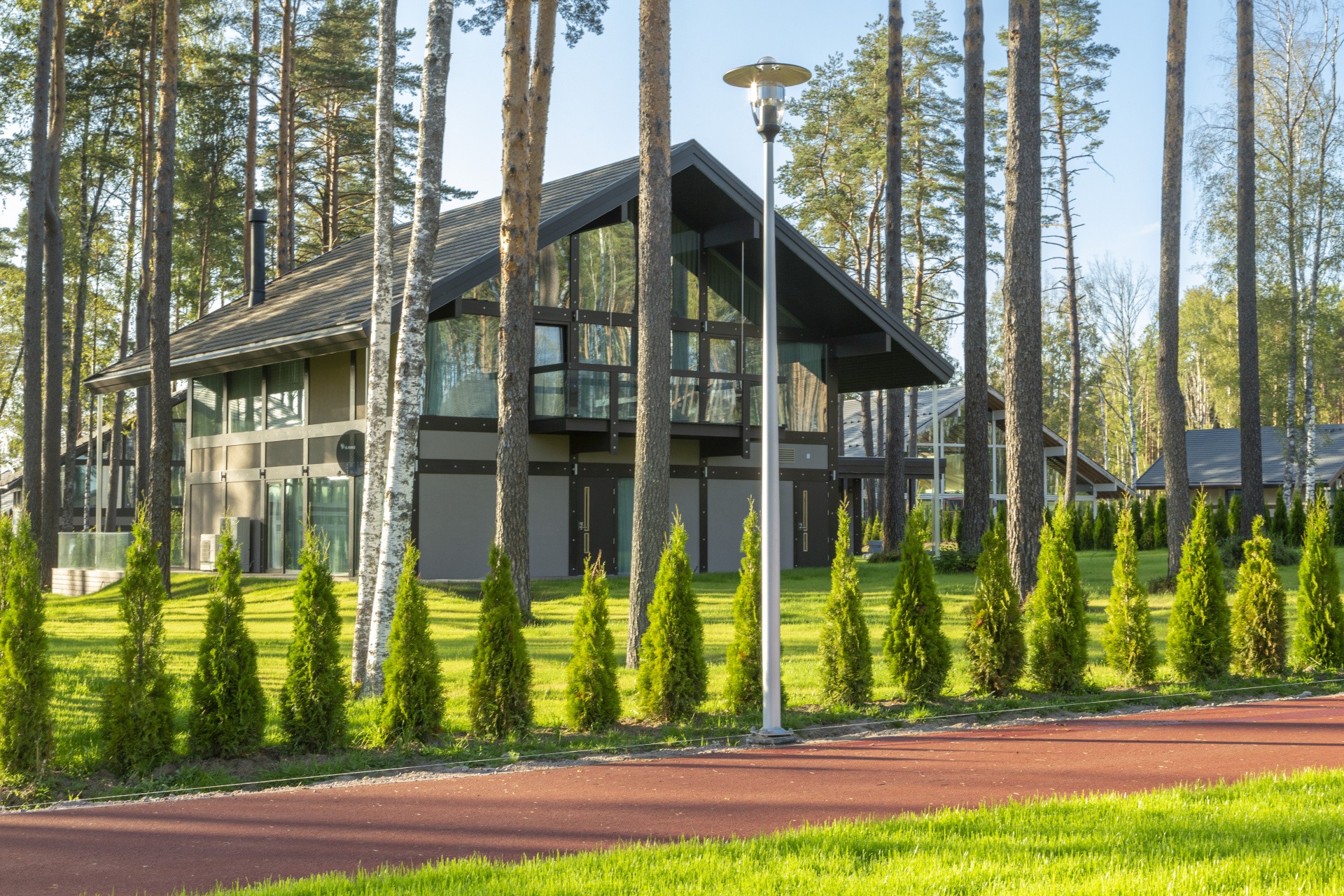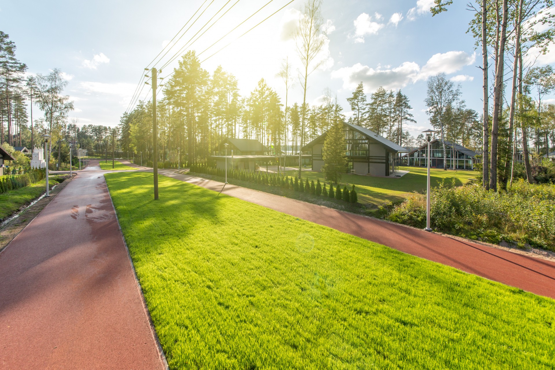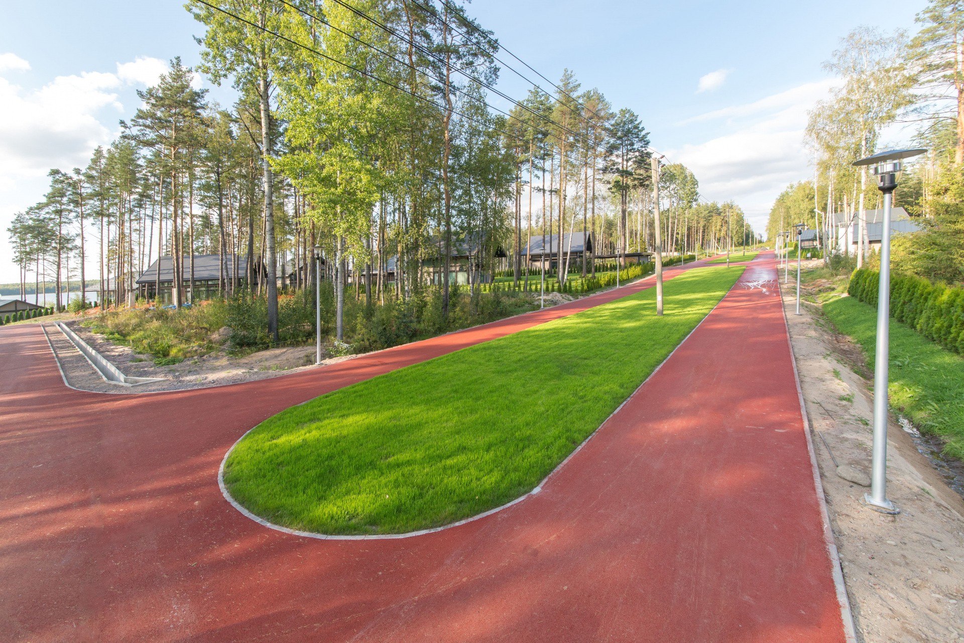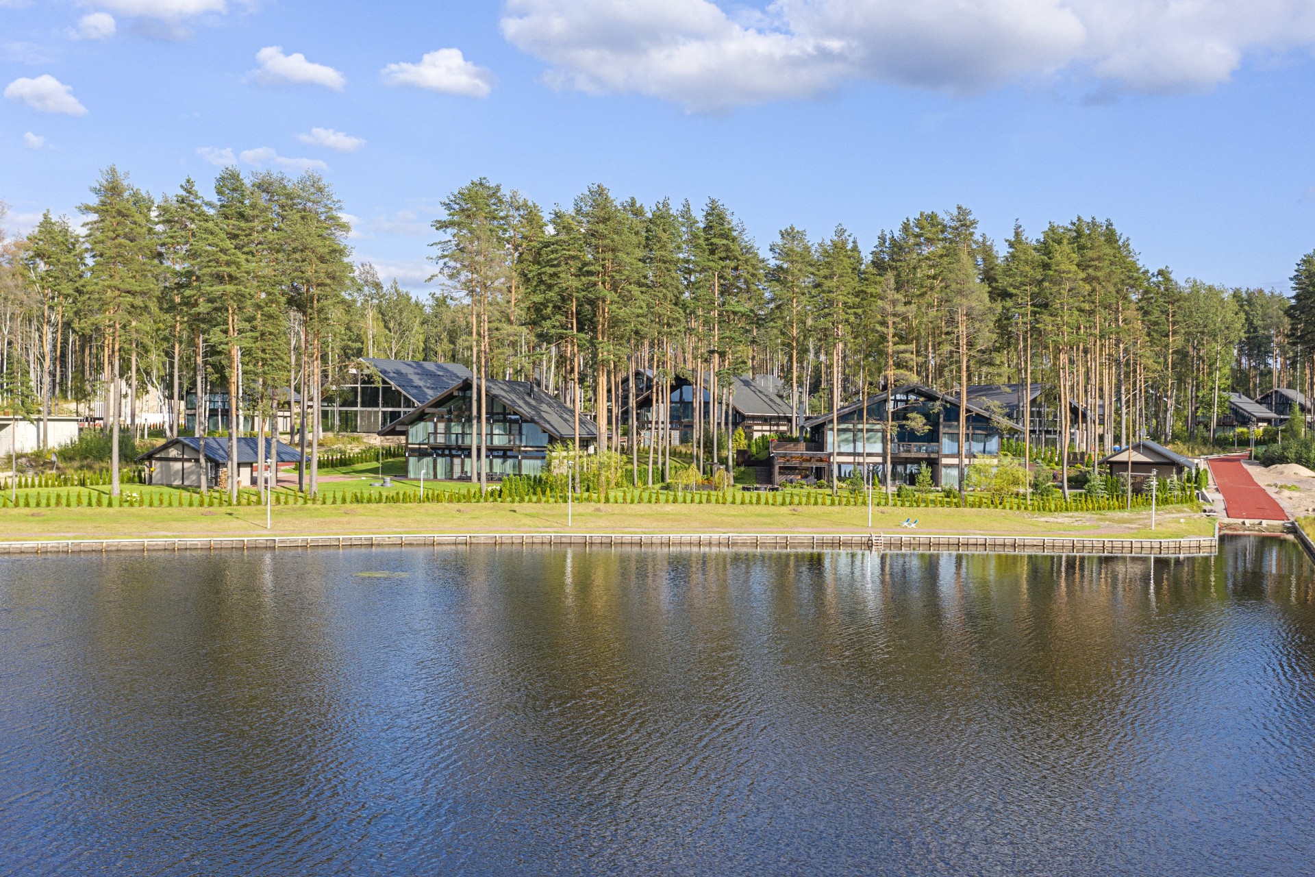 В посёлке всего 45 участков с домовладениями. На каждом участке есть крытая парковка на 2-3 автомобиля, хозяйственное помещение, посевной газон и ландшафтный дизайн.