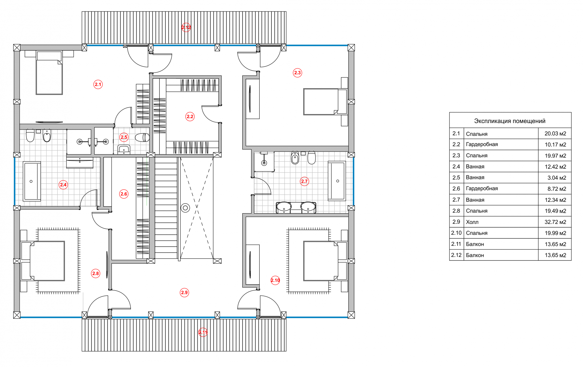 На втором этаже расположены три детские спальные комнаты, две с общим санузлом и большим гардеробом, одна с индивидуальным санузлом. Так же для комфорта владельцев дома на втором этаже предусмотрена хозяйская мастер-спальня с превосходными видовыми характеристиками, с просторной гардеробной и ванной комнатой с панорамным окном.