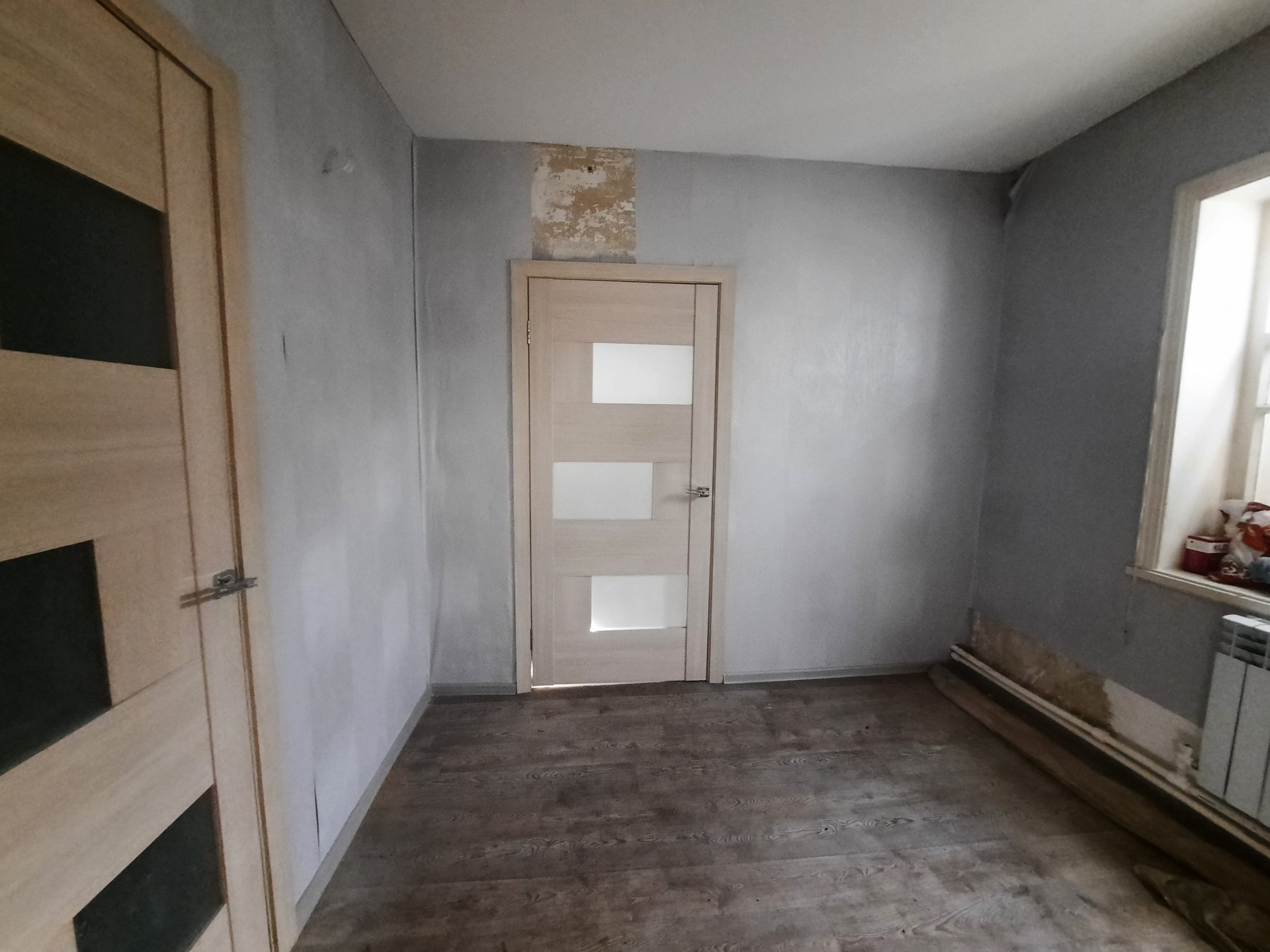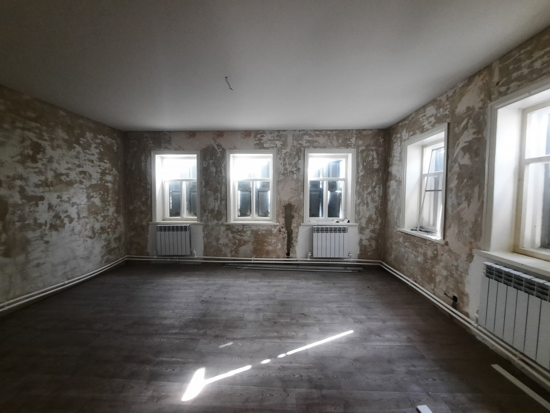 В зале стены поштукатурены и готовы к поклейке обоев.