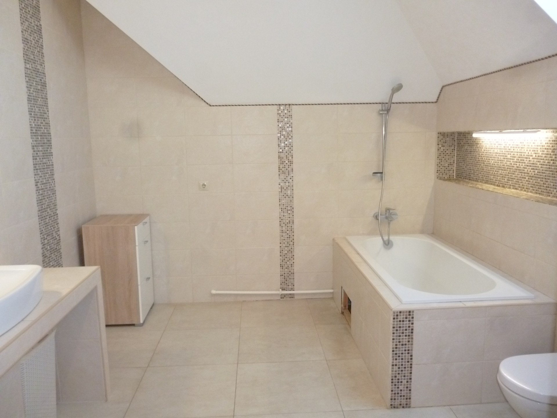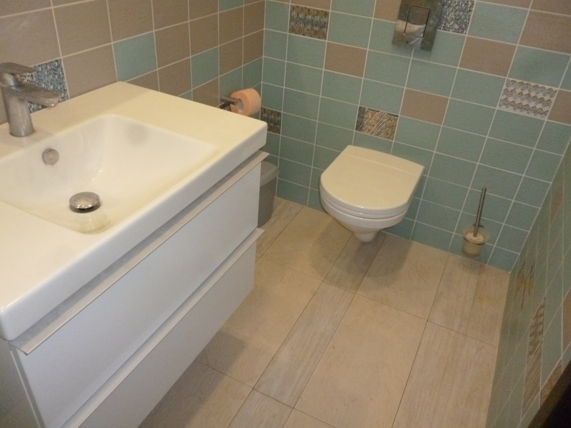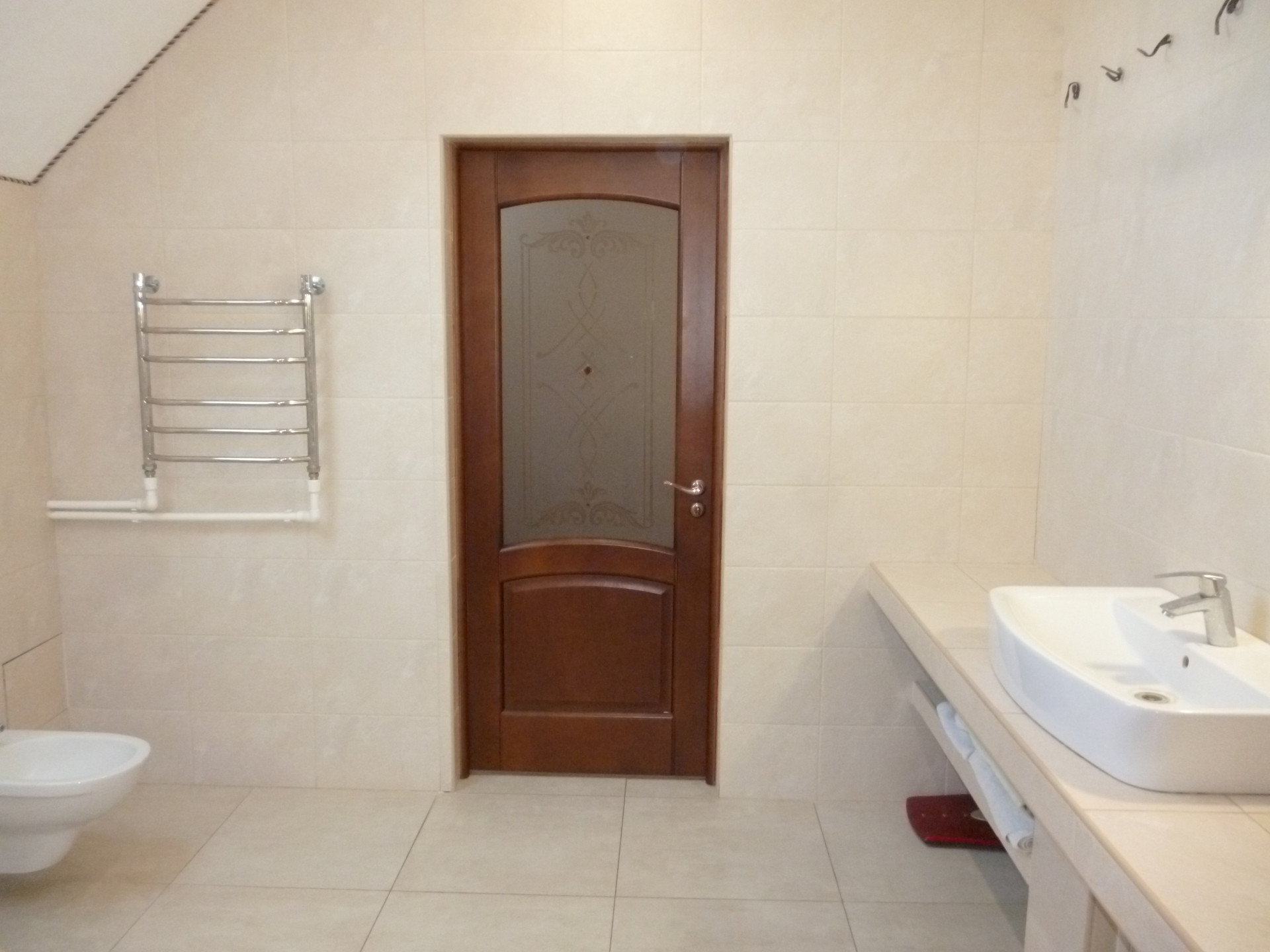 В доме три сан/узла- один на первом этаже для семьи, второй на первом этаже для гостей, третий на втором этаже для семьи.