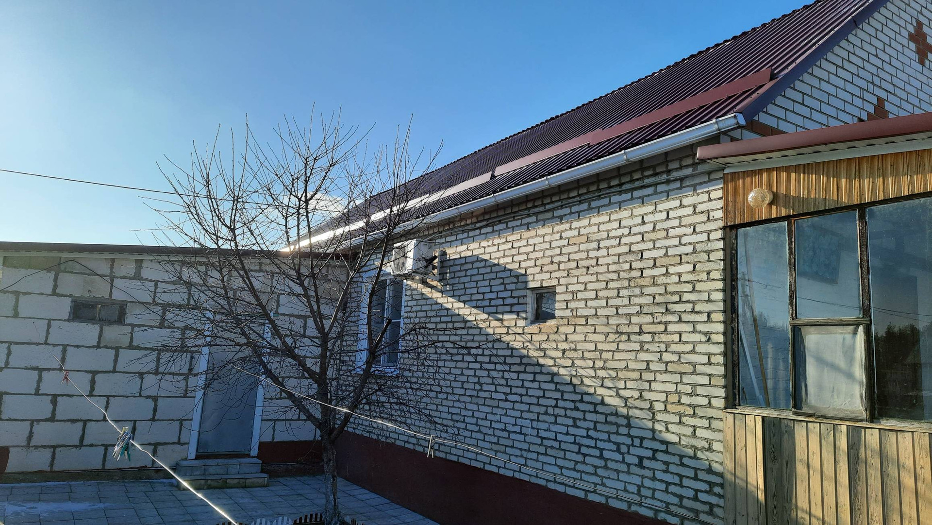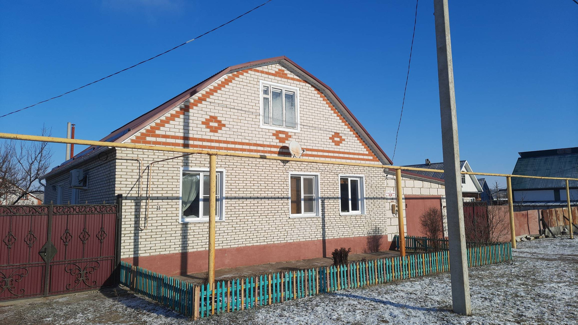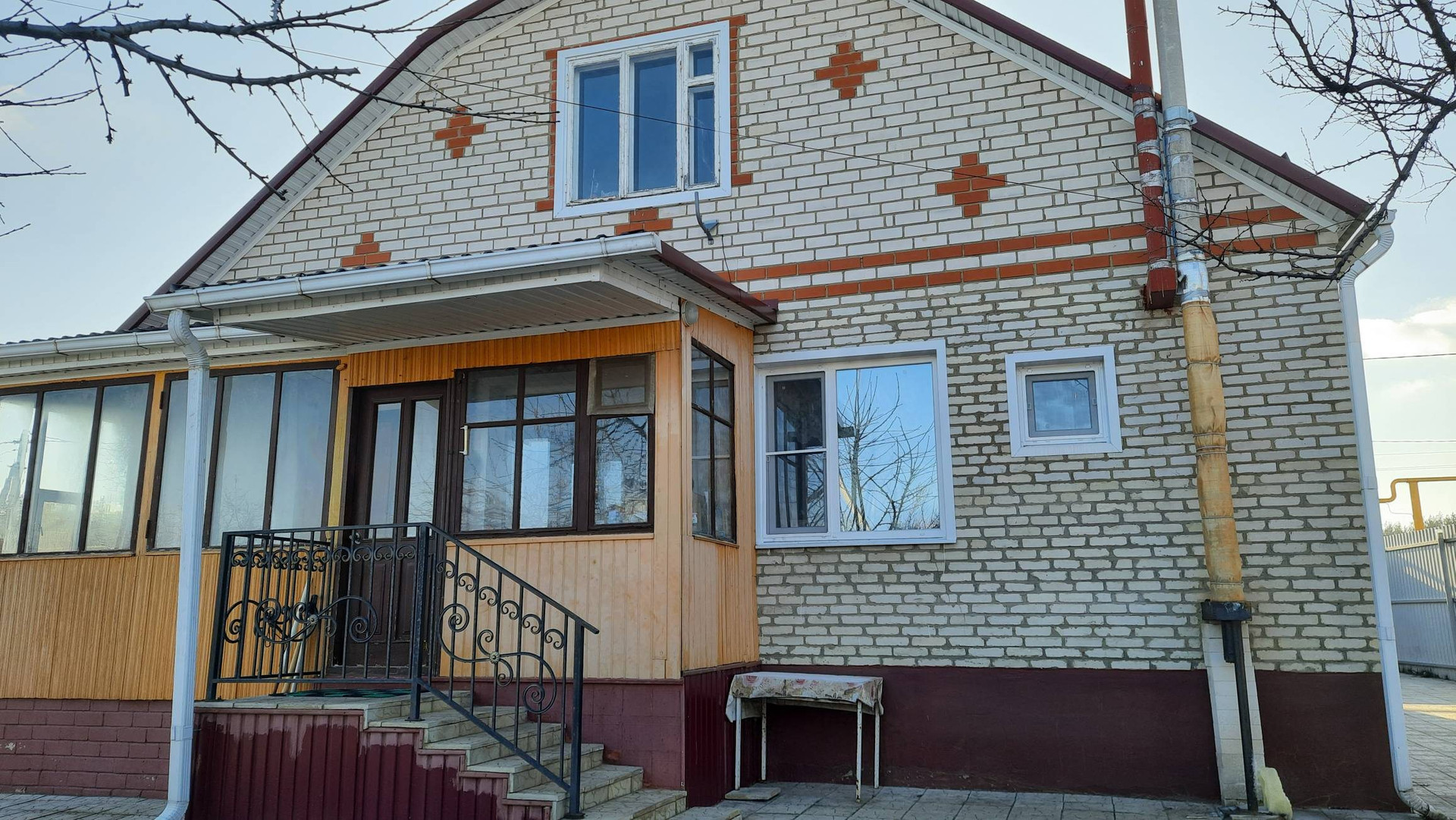 Комфортабельный жилой дом.  Площадь 114 м кв + мансарда 40 м кв. Фундамент - блоки ФБС, материал стен - газобетонные блоки обложенные силикатным кирпичом, полы 1 этажа - по металлическим балкам, полы мансардного этажа - по деревянным балкам. Крыша - металлопрофиль.  Отопление - газ. Центральный водопровод. Скважина для полива. Два кондиционера. Новые пластиковые окна. Канализация - выгребная яма.  Все удобства в доме. Проводной интернет.