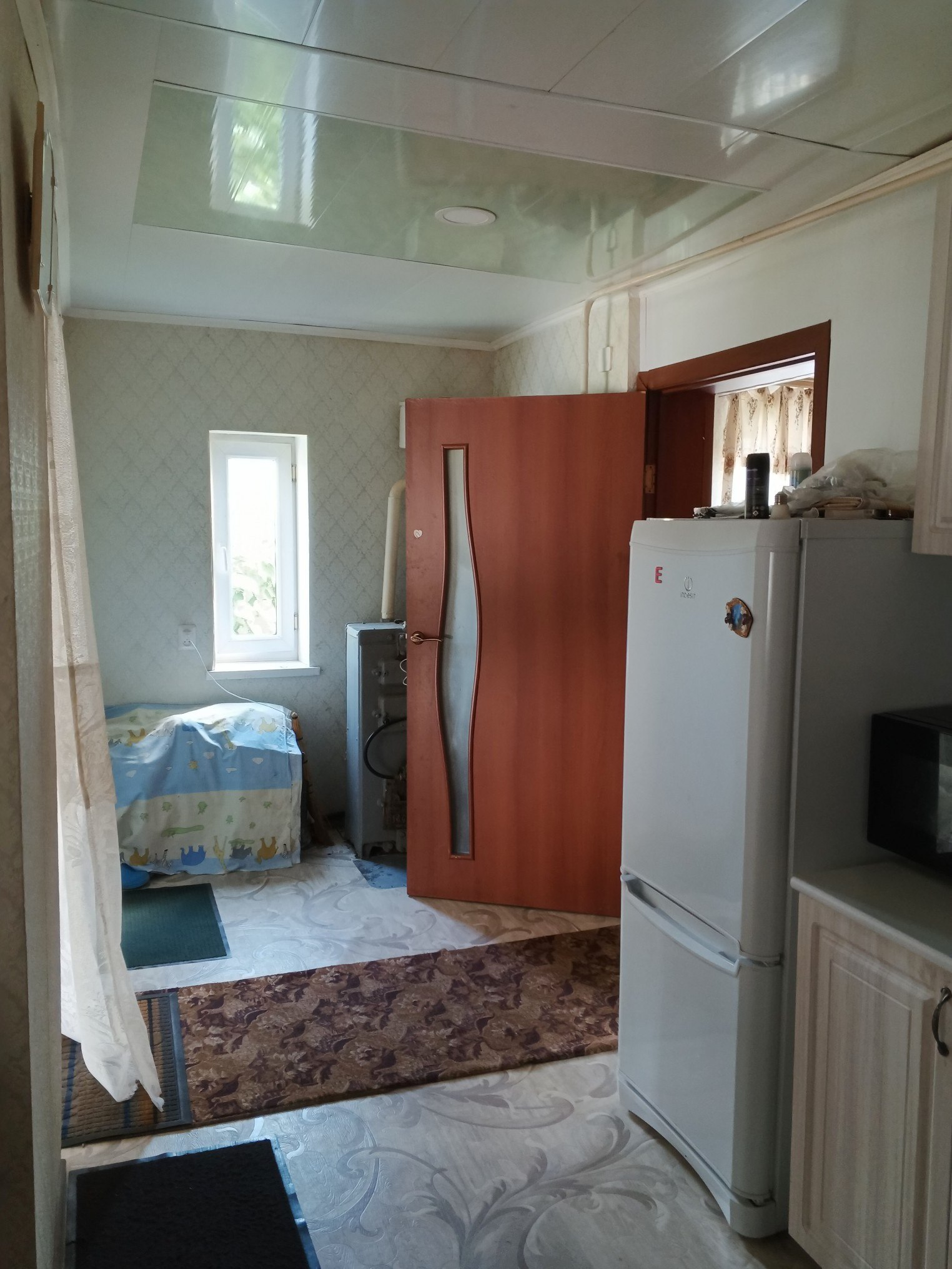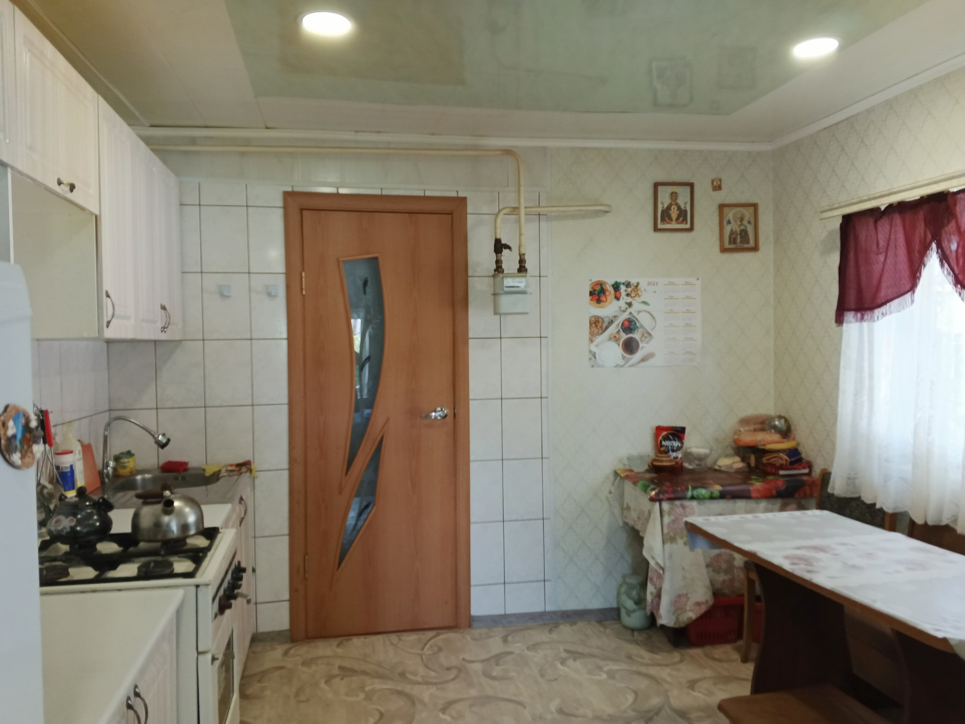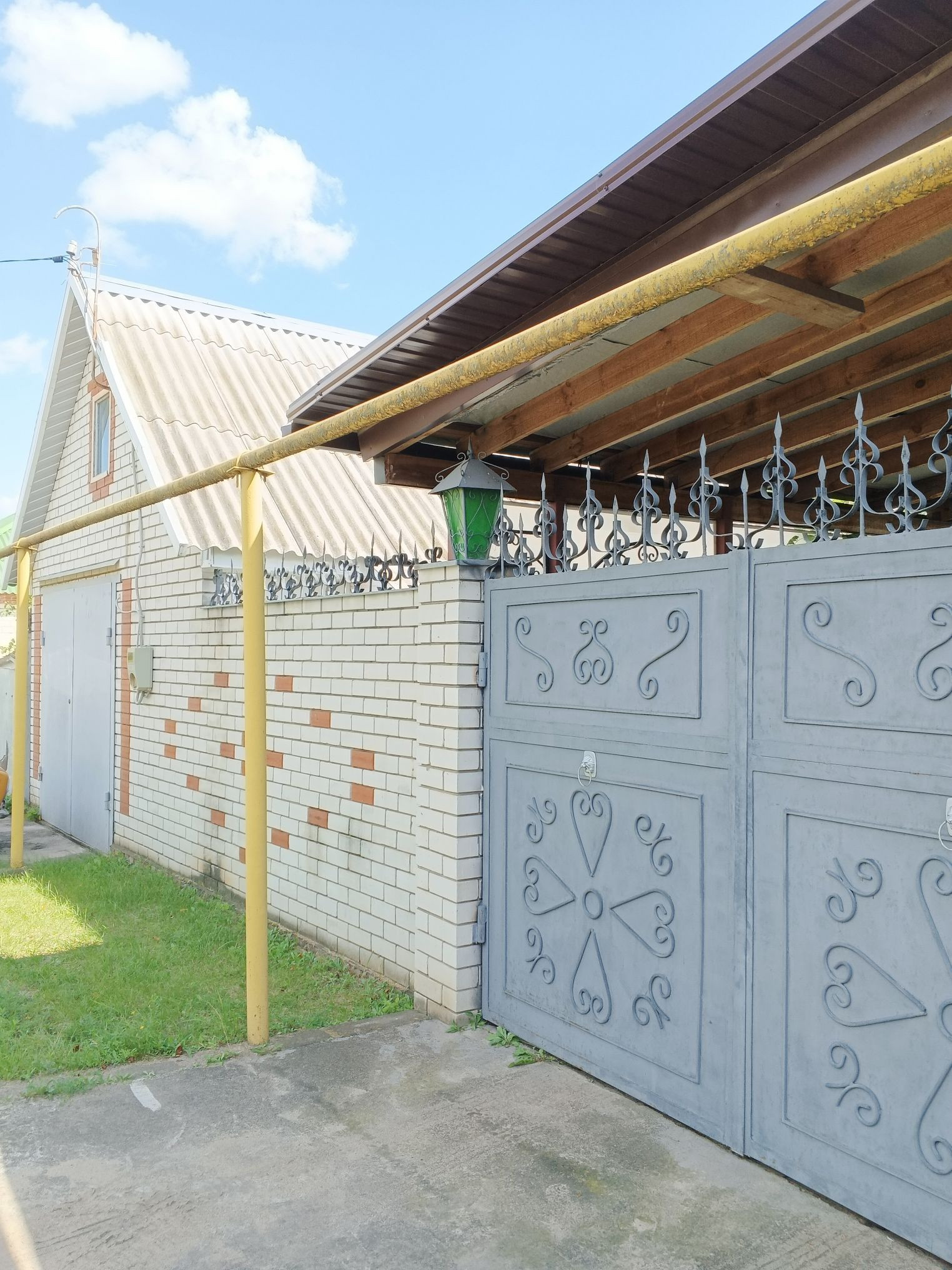 Дом в очень хорошем месте, рядом школа, детский сад, магазины, остановка. Новая крыша переходящая в навес из металлоконструкции во дворе. Пластиковые окна, новый котёл. Большая кухня 16 м², санузел совместно, отделка кафель. Во дворе новый гараж на две машины и две комнаты для бани ( для парилки и душевой). Хоз постройки, беседка, виноградник. Высокий фундамент.