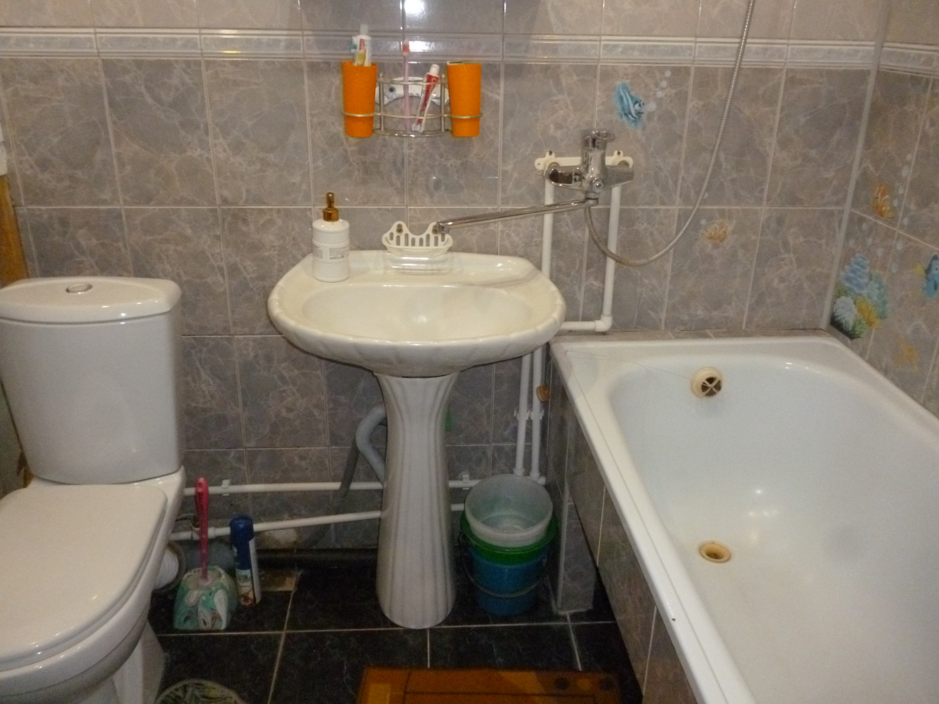 стены и пол ванной и туалета и потолок в кафеле,