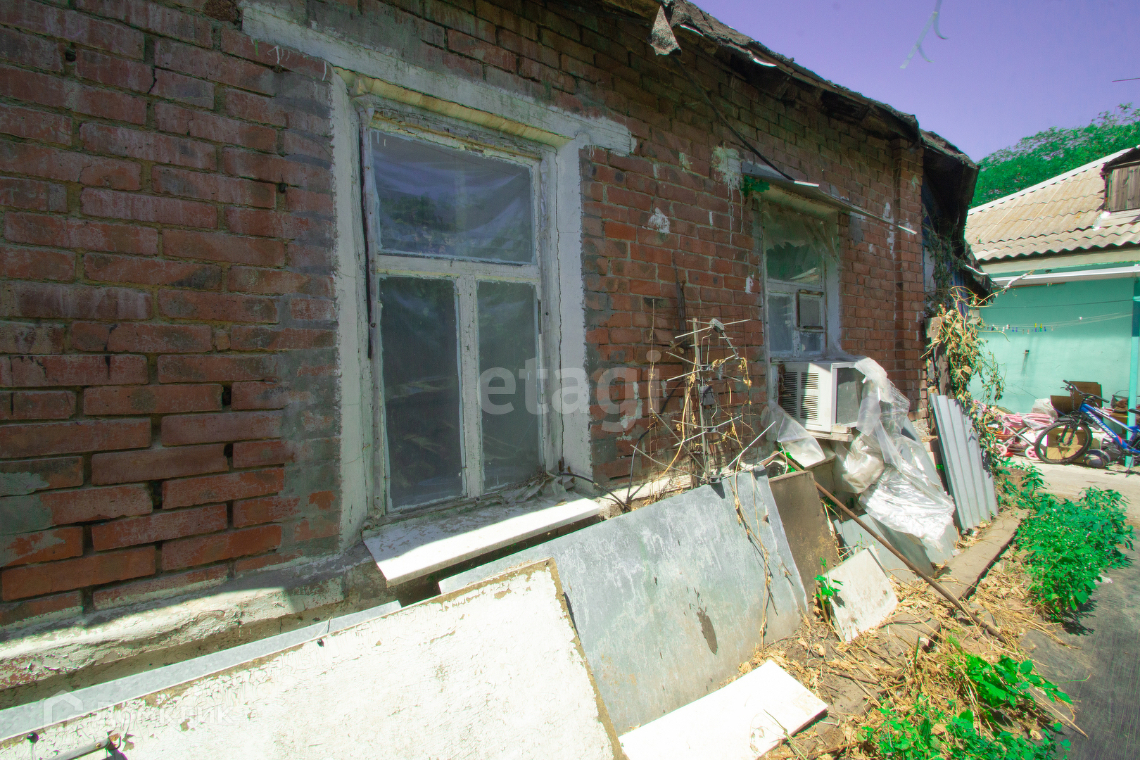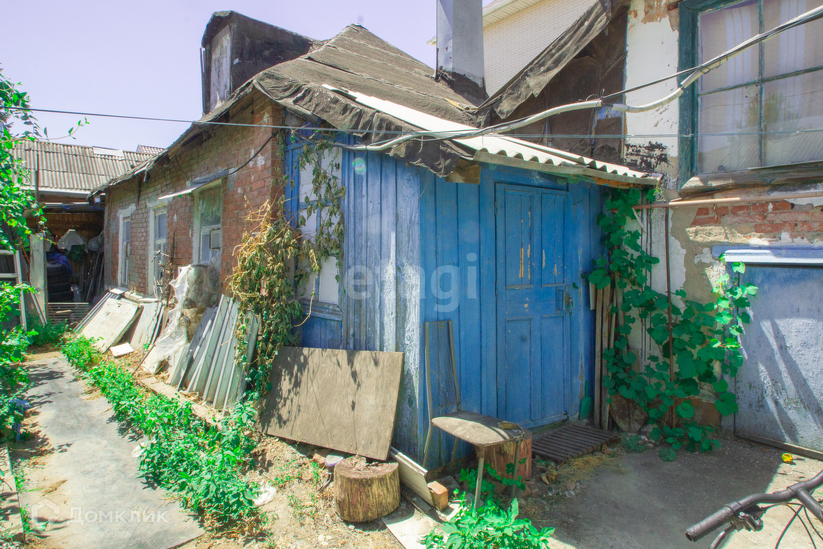 Старенький, крепкий, отдельно стоящий домик 34м., саман+кирпич, на общем участке с общим двором 5соток. земли 0,8 сотки. Межевание проводилось. Дом отдельно стоящий во дворе(не проходной, окна на забор и клумбу.