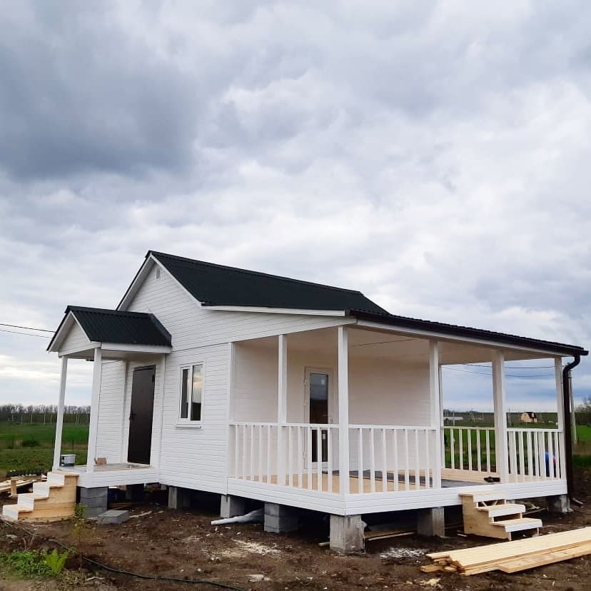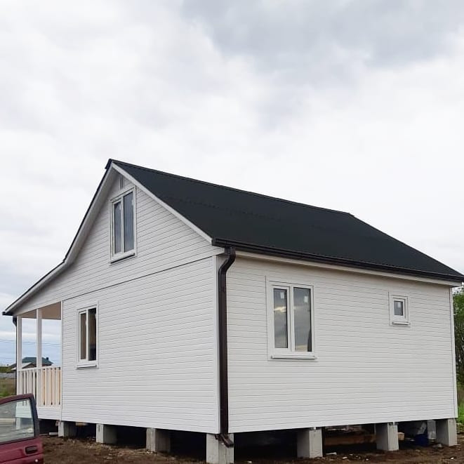 Дом каркасно-щитовой, буронабивной фундамент, толщина стен 120 мм, фасад Евровагонка, внутри вагонка Штиль, крыша металлочерепица, срок строительства 14 дней