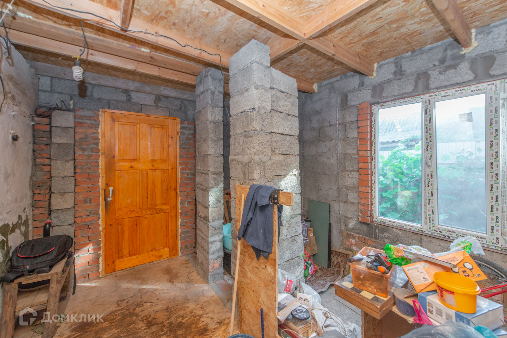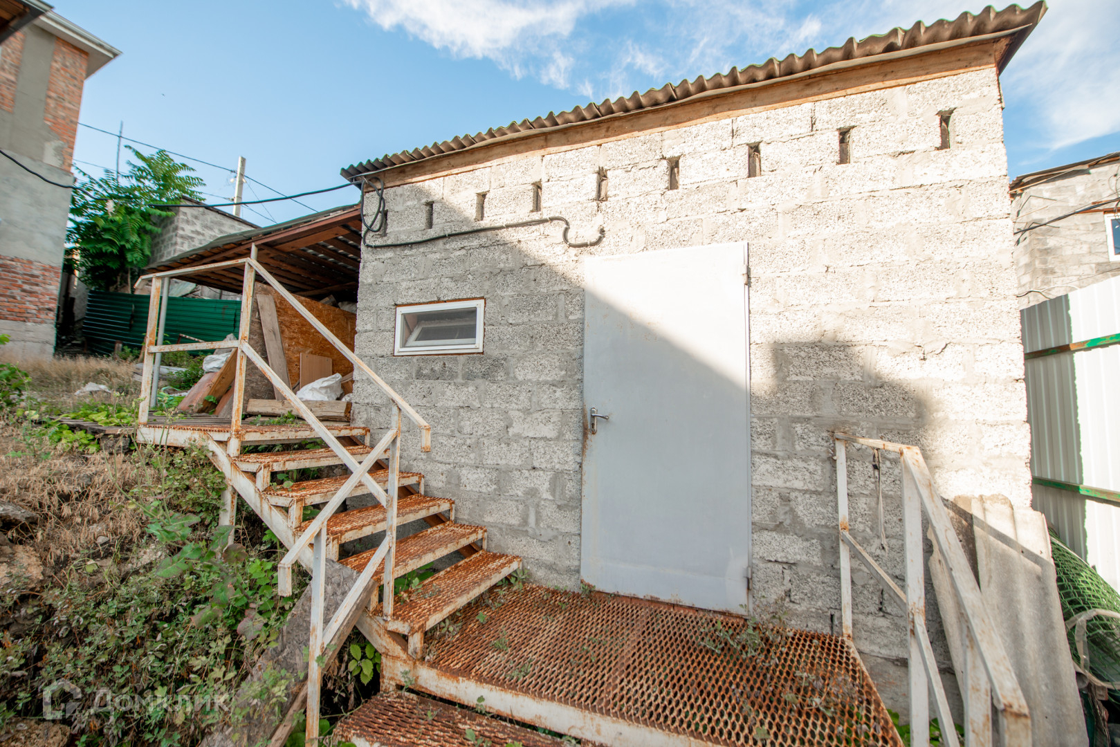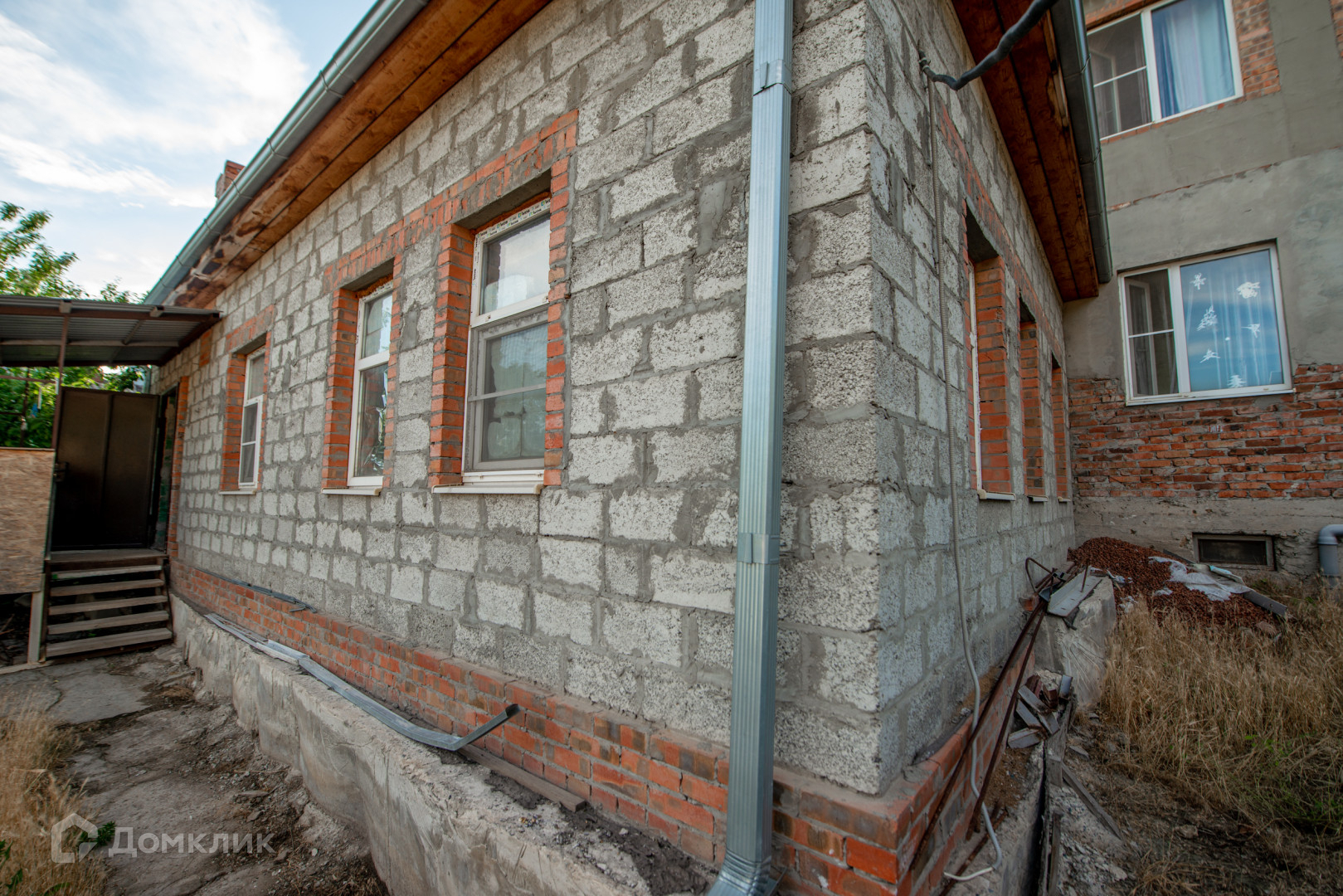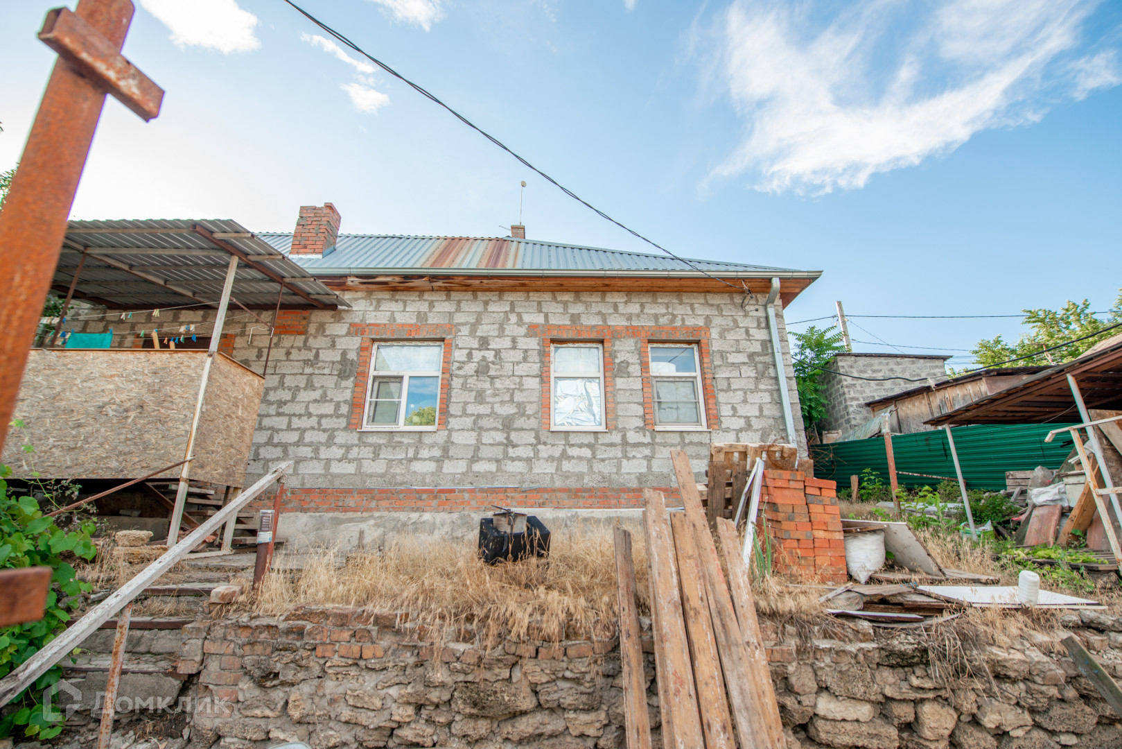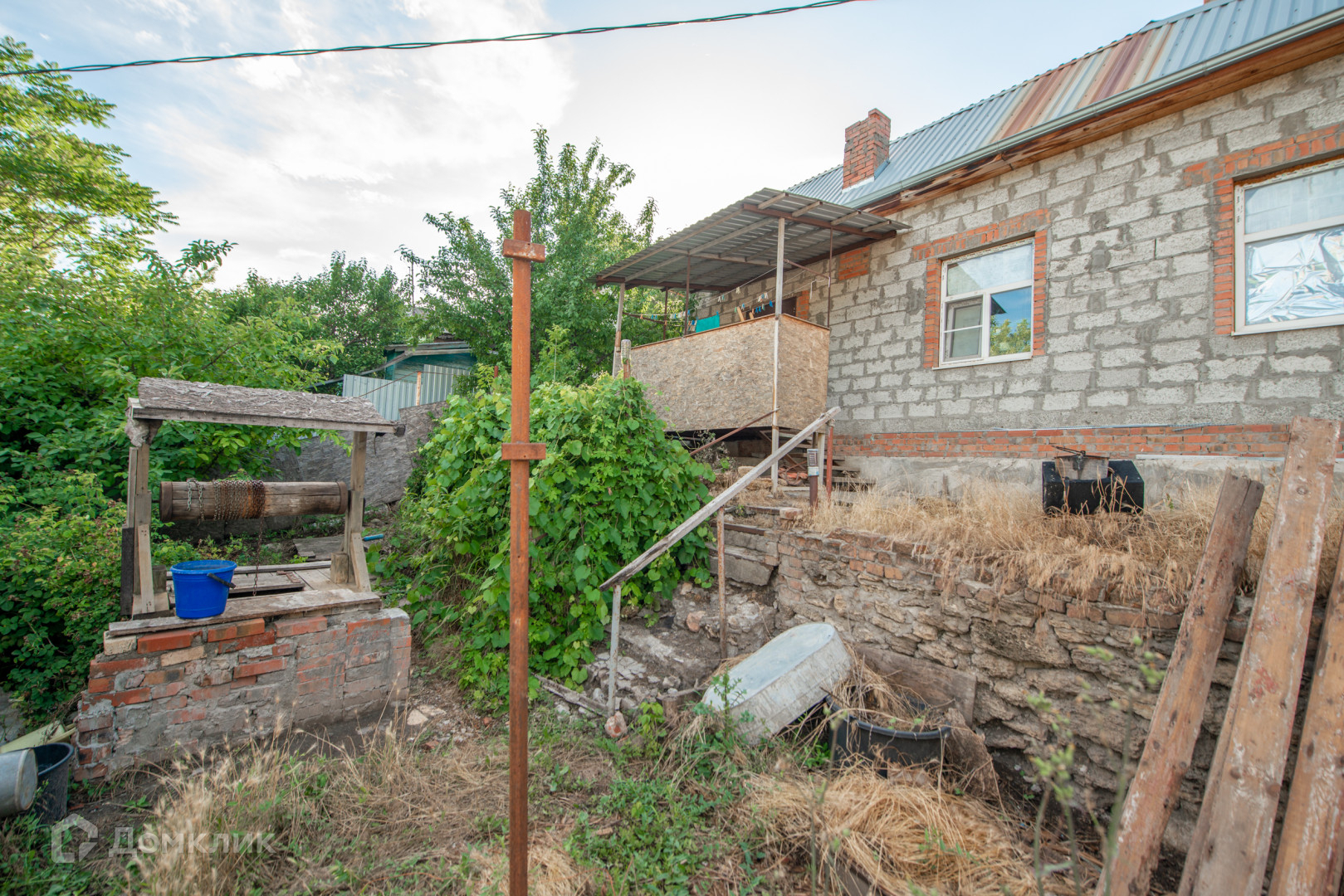 Дом обложен шлакоблоком.В доме 4 комнаты .Во дворе есть баня.Из бани можно провести воду,есть выход.