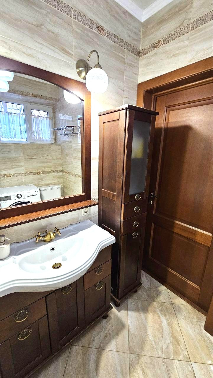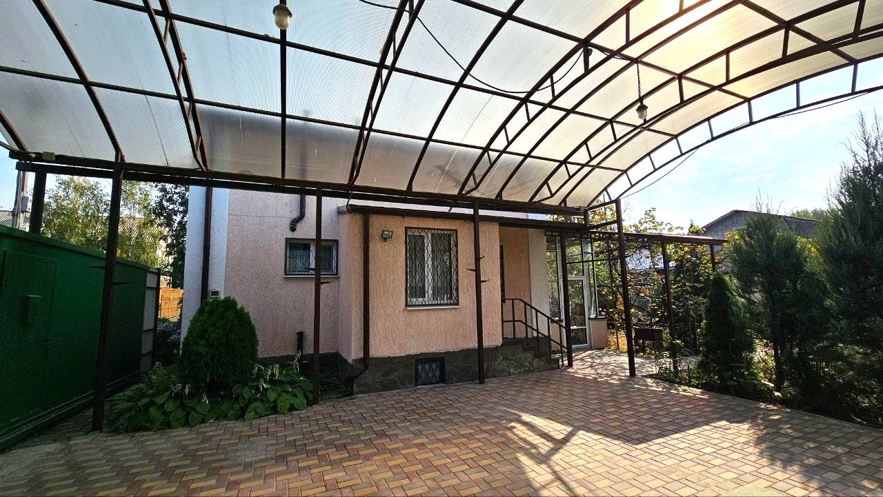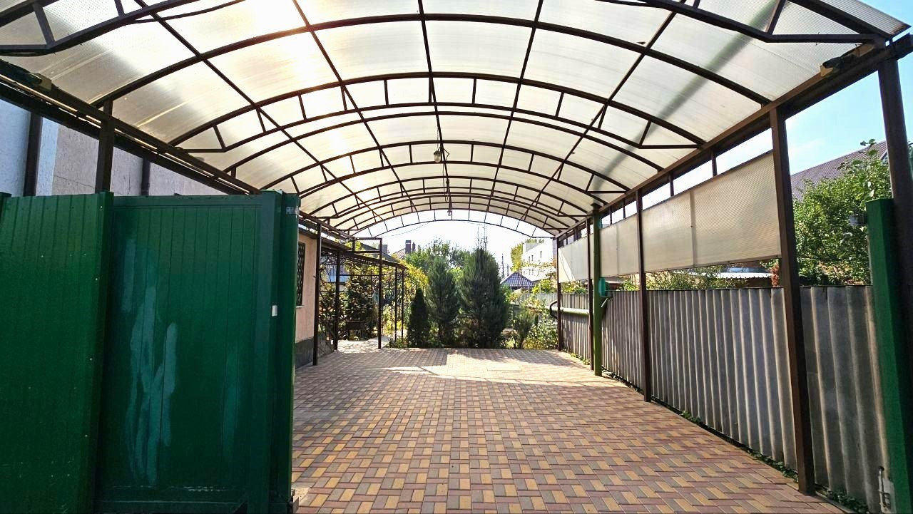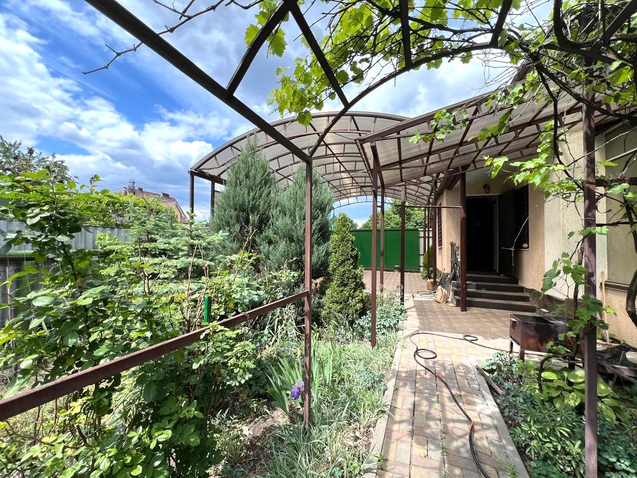 Все коммуникации заведены в дом, свет, газ, вода, интернет, видеонаблюдение. Помимо городского водопровода, есть скважина и система для полива. Во дворе летний душ и туалет, вольер для собаки. Двор выложен тротуарной плиткой, въезд для 2-х автомобилей с поликарбонатным навесом, автоматические ворота шириной 4м.Двор очень зеленый -декоративные пихты, виноград, розы, фруктовые деревья.