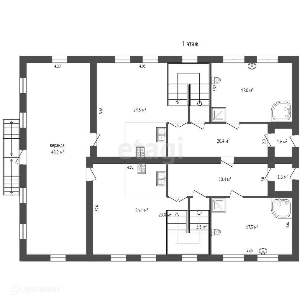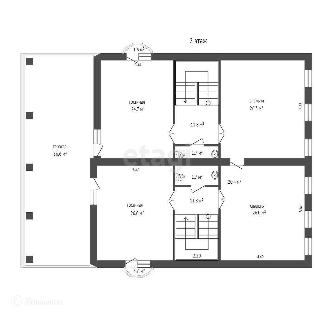 Дом состоит из двух этажей с мансардным и цокольным этажами, предлагая просторные и светлые помещения. На первом этаже расположены две уютные кухни-гостиные с встроенной мебелью и техникой, а также веранда площадью 42.8 м² с двумя выходами во двор. На втором этаже находятся по две спальни по 28 м² в каждой половине дома, где установлены мраморные камины, создающие атмосферу уюта и тепла. Из комнат открывается выход на просторную террасу площадью 56.6 м² с захватывающими видами на окрестности. Также на этом этаже расположены современные санузлы.