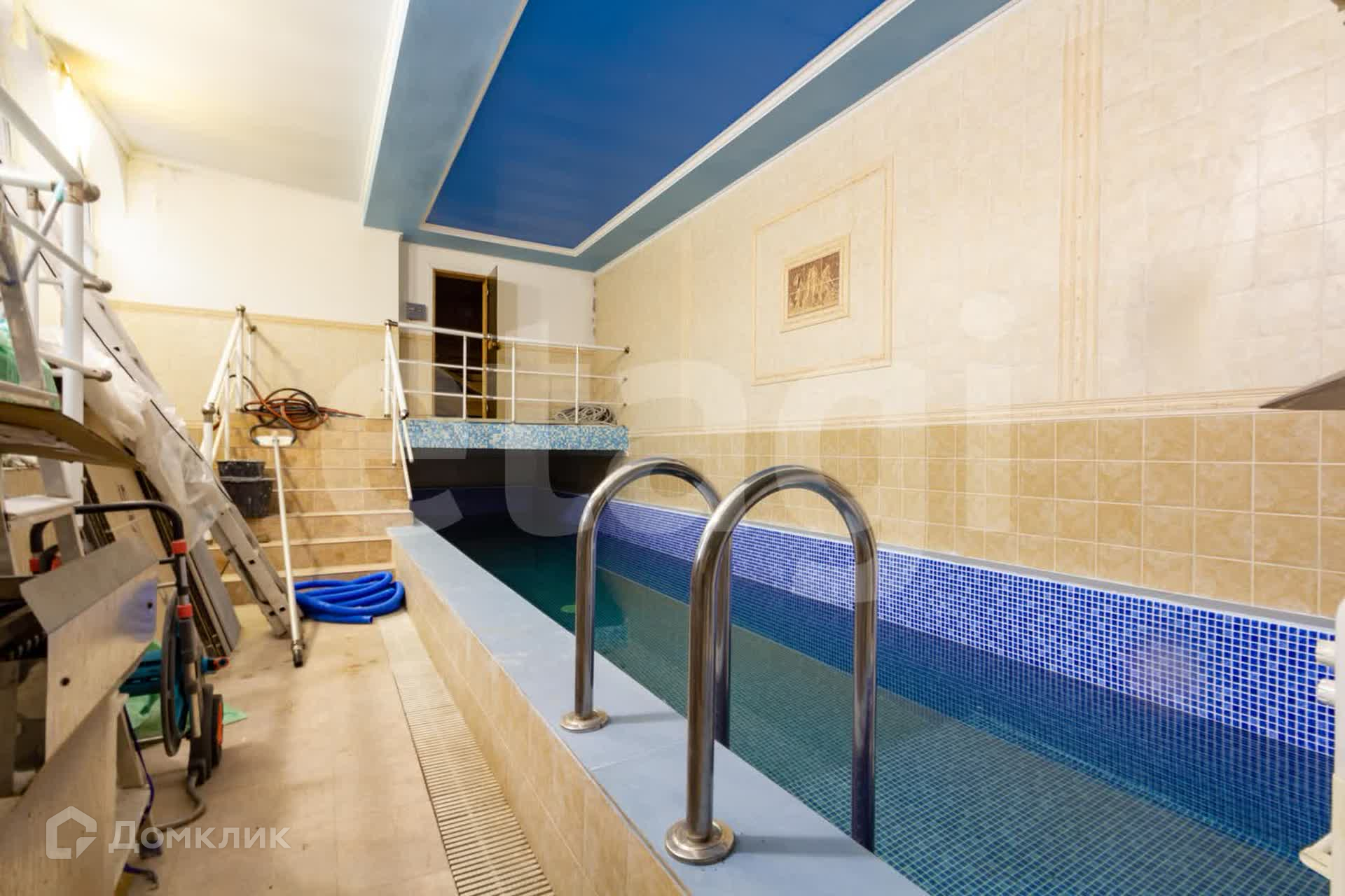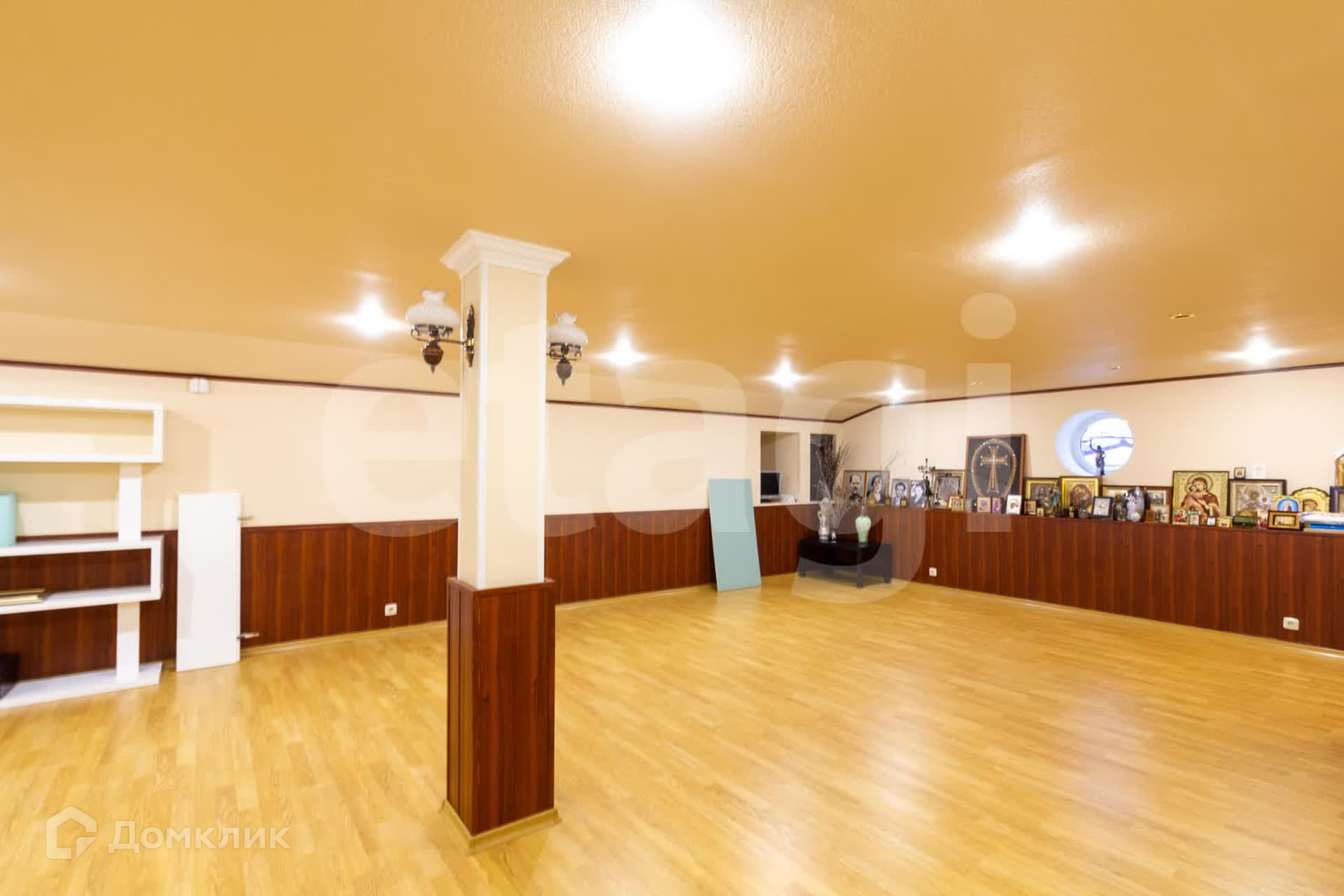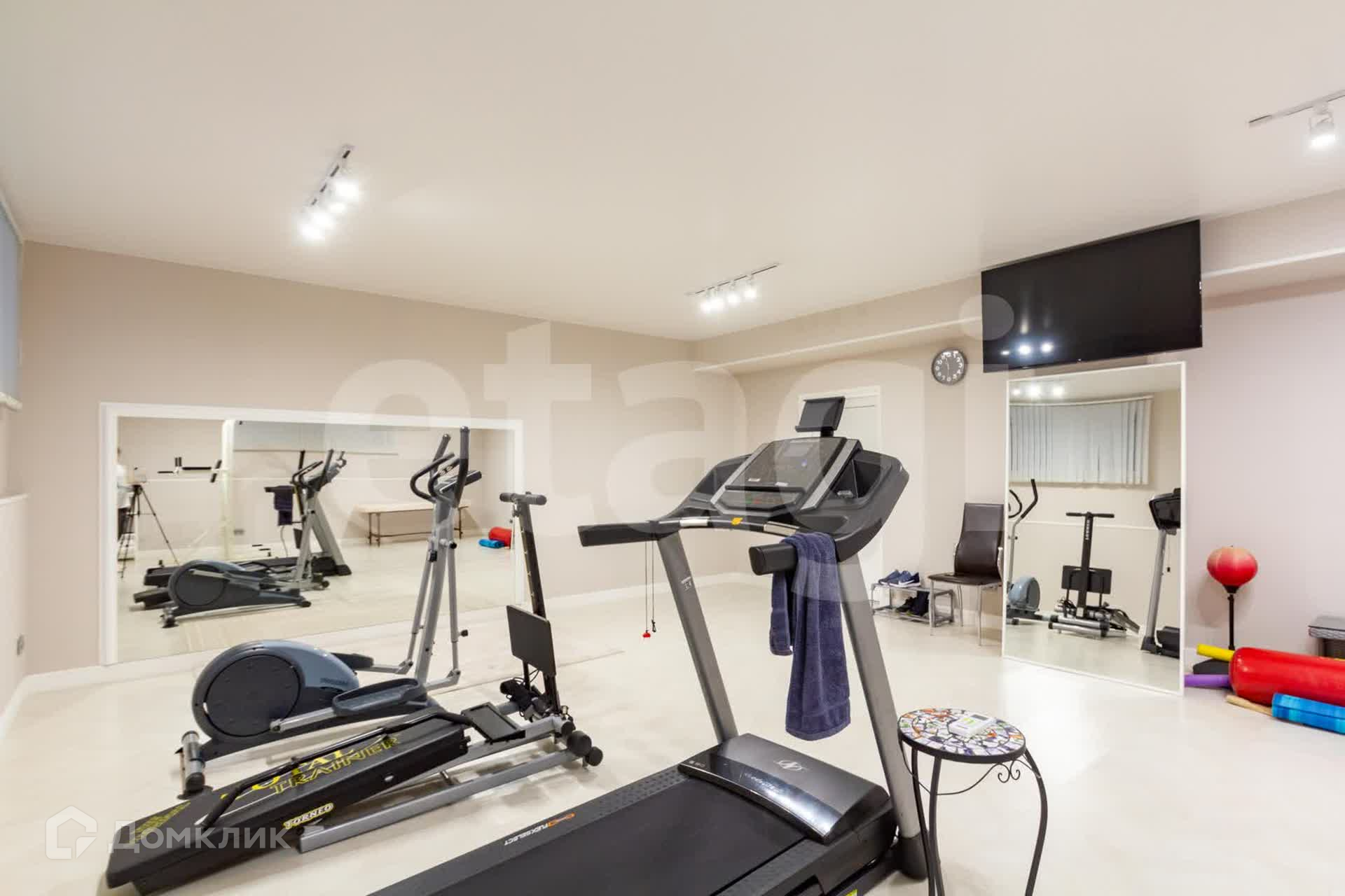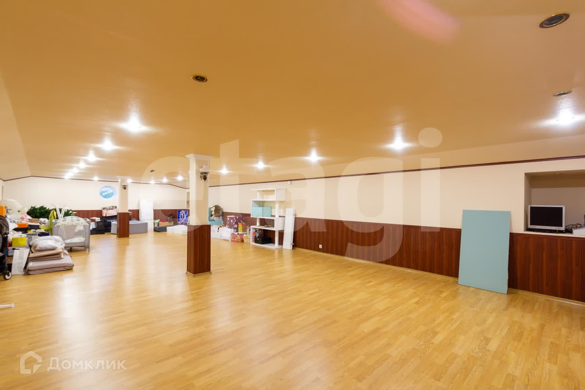 Цокольный этаж: в нем расположен подземный гараж, большой холл, в котором оборудована кухонная зона (абсолютно новая, ни разу не использовалась, даже пленка еще осталась в духовом шкафу). Также спортзал и отдельная кладовая комната. Через цокольный этаж возможно попасть в помещение с бассейном, расположенное во дворе.