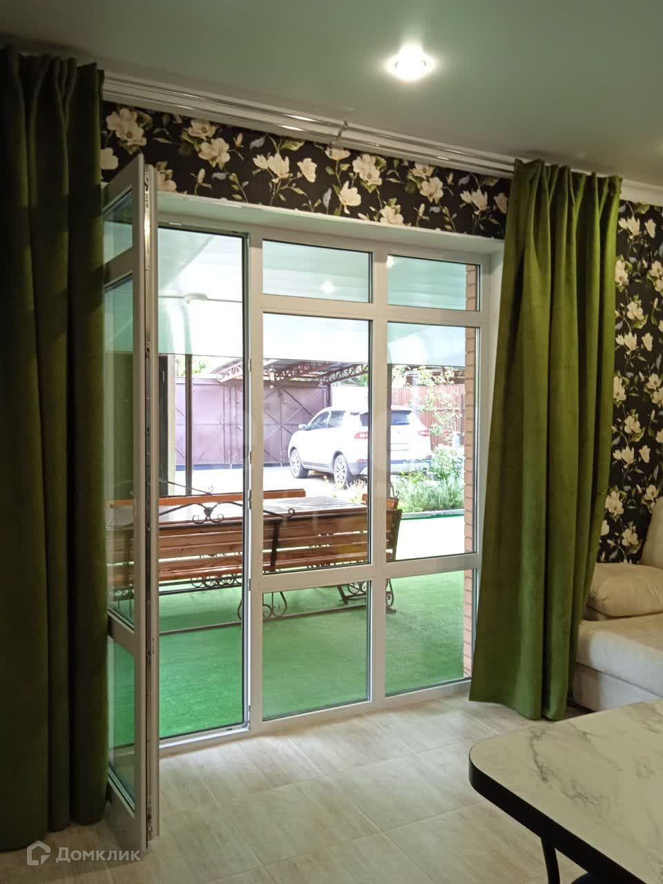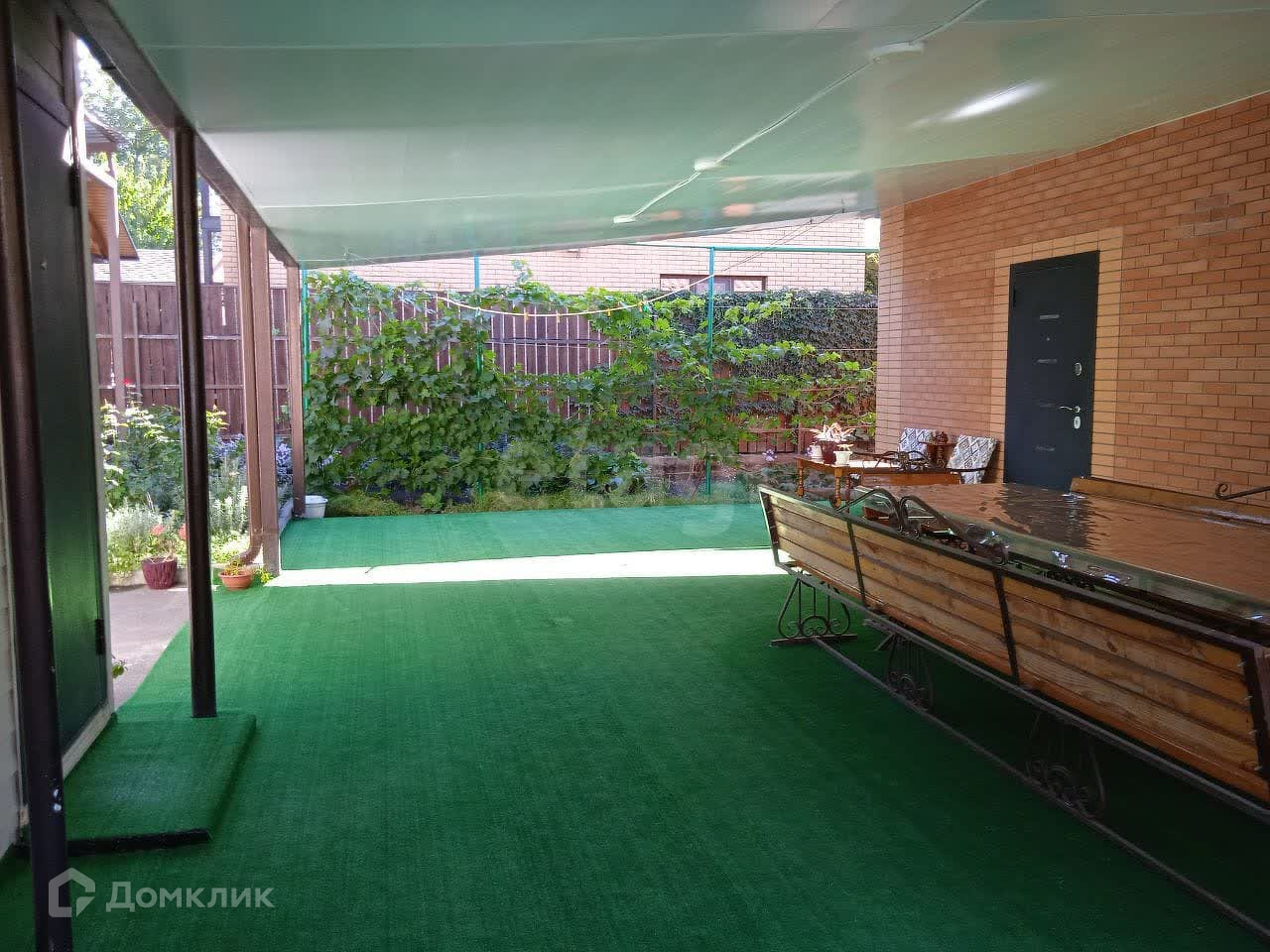 В доме 2 раздельные спальни, кухня-гостиная с выходом на террасу, санузел, котельная, теплый пол. Терраса с освещением 6*10=60 м2 (можно остеклить или закрыть др.материалом). Пол на террасе бетонный, покрытый смолой , поверх которого постелена искусственная зеленая трава.
