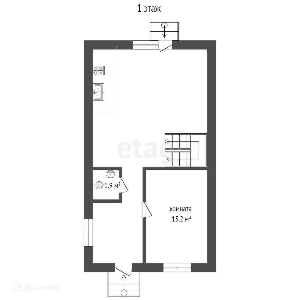 На первом этаже расположена большая студия ( выход в зону отдыха-барбекю), отдельная спальня, большая прихожая и санузел.