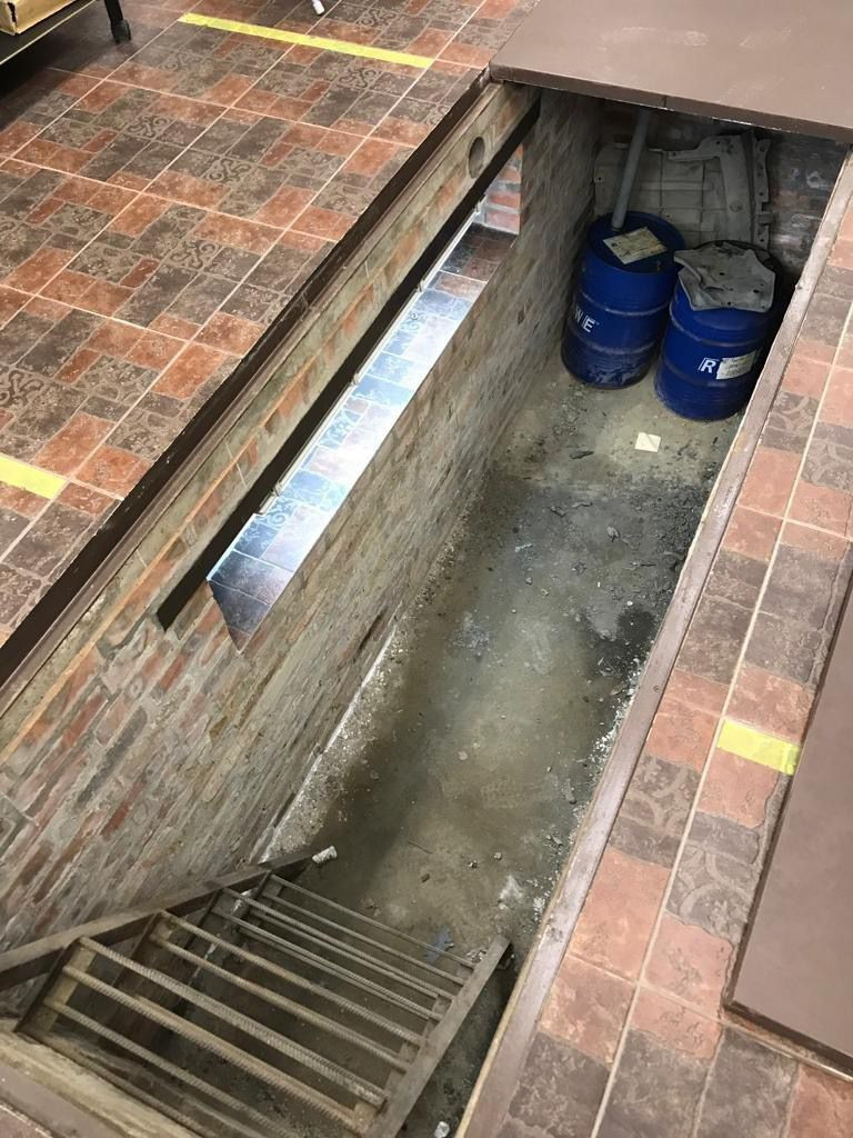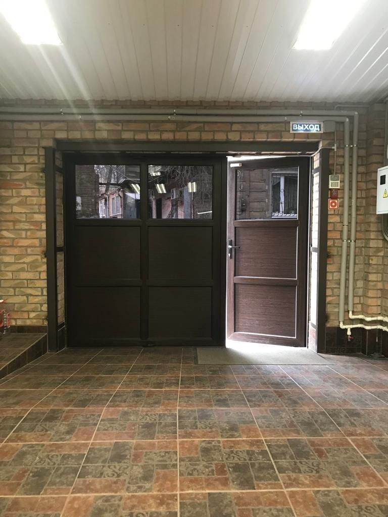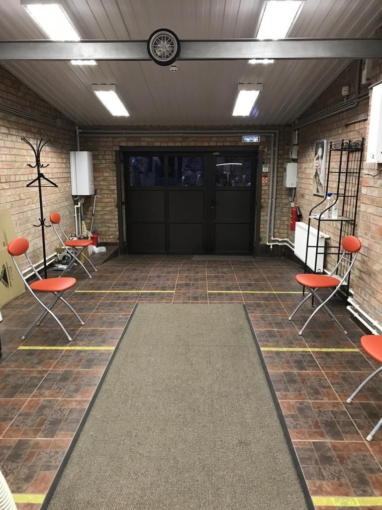 Имеется смотровая яма, с полками и освещением, размером 350см на 100см. Над ямой кран-балка с кареткой под лебедку.