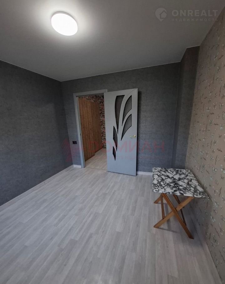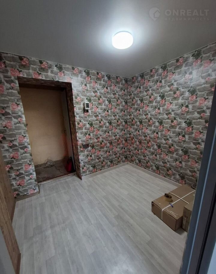 Комната разделена перегородкой, можно оборудовать кухню.