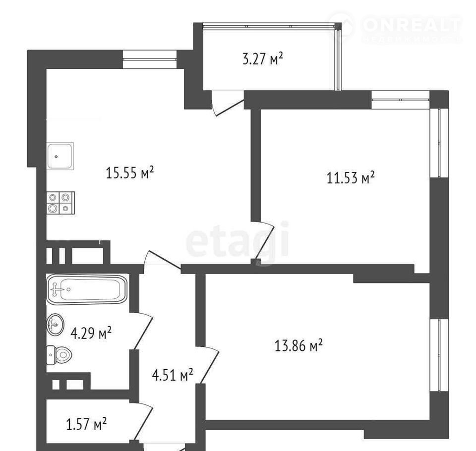 * Кухня-гостиная: 15,55 кв.м. с выходом на лоджию. Достаточное пространство для кухонного гарнитура, обеденной и гостевой группы.