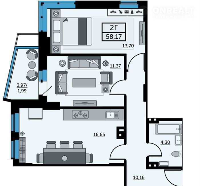 Общая площадь 57.9 м2