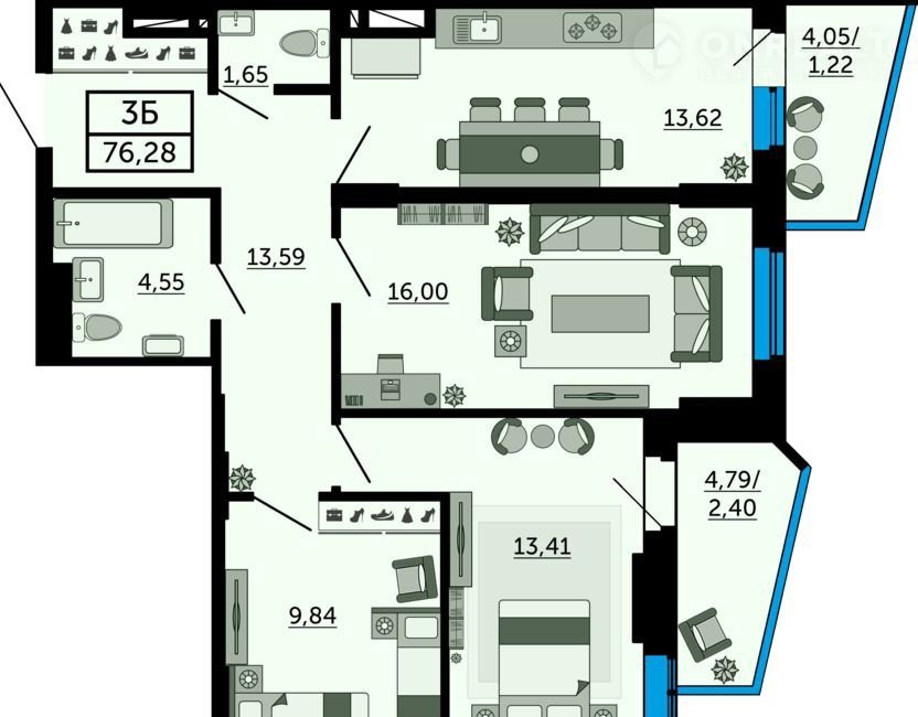 Общая площадь 76.3 м2