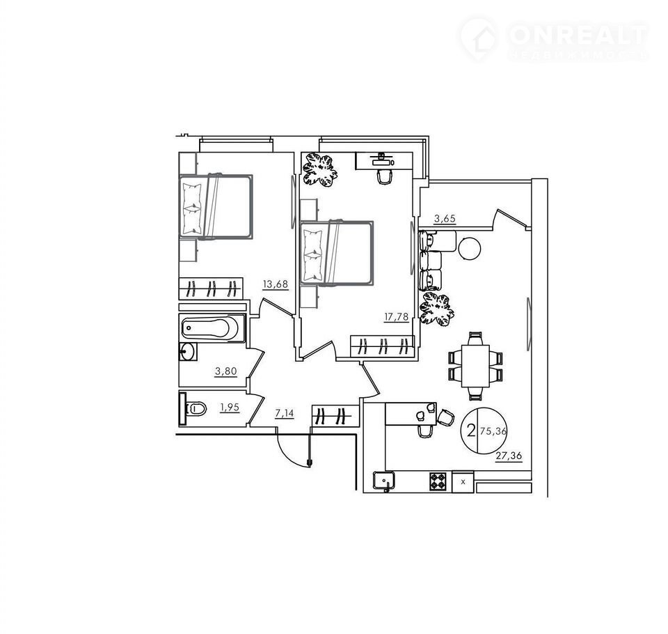 Общая площадь 75.4 м2
