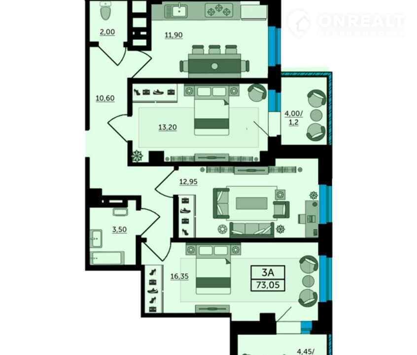 Общая площадь 74.7 м2