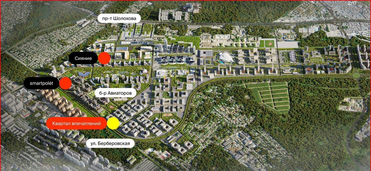 Комплекс     расположен в Новом Ростове, на территории     бывшего аэропорта. В     10 минутах транспортом находятся ТЦ     Мега, гипермаркет Лента, Центральный     автовокзал и Театральная площадь. До     железнодорожного вокзала — 30 минут     транспортом, до аэропорта — 40 минут.     Вблизи находятся два парка — Авиаторов     и новый городской парк — в пешей     доступности от комплекса.