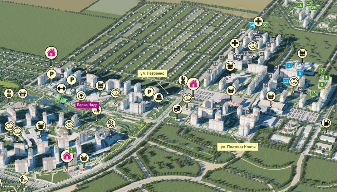 На территории: школа, 3 детских сада, торговый центр, поликлиника, парк и даже набережная с озерами!