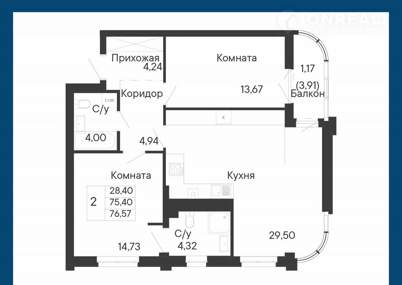 Общая площадь 76.6 м2
