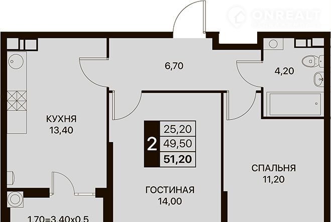 Общая площадь 51.2 м2