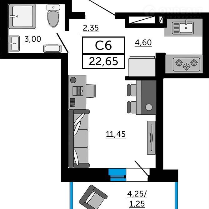 Общая площадь 22.7 м2
