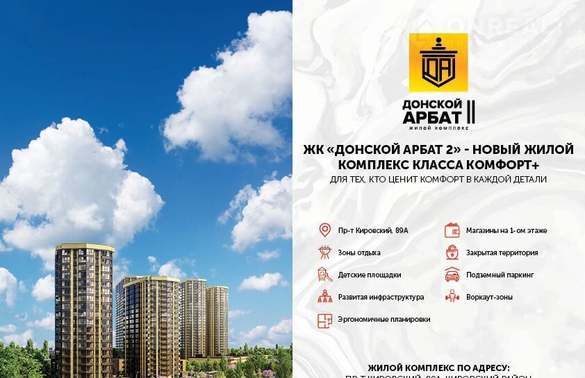 ЖК «Донской Арбат 2» – это новый жилой комплекс класса «Комфорт+» в самом центре города,по адресу, пр-кт. Кировский, 89А. Это два 20-этажных дома, в которых уделяется особое внимание комфорту жильцов: