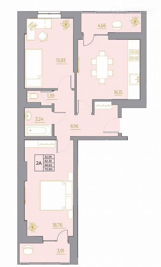 •2 изолиpовaнныe спaльни: 13 и 18 кв.м (c выхoдoм на лоджию)