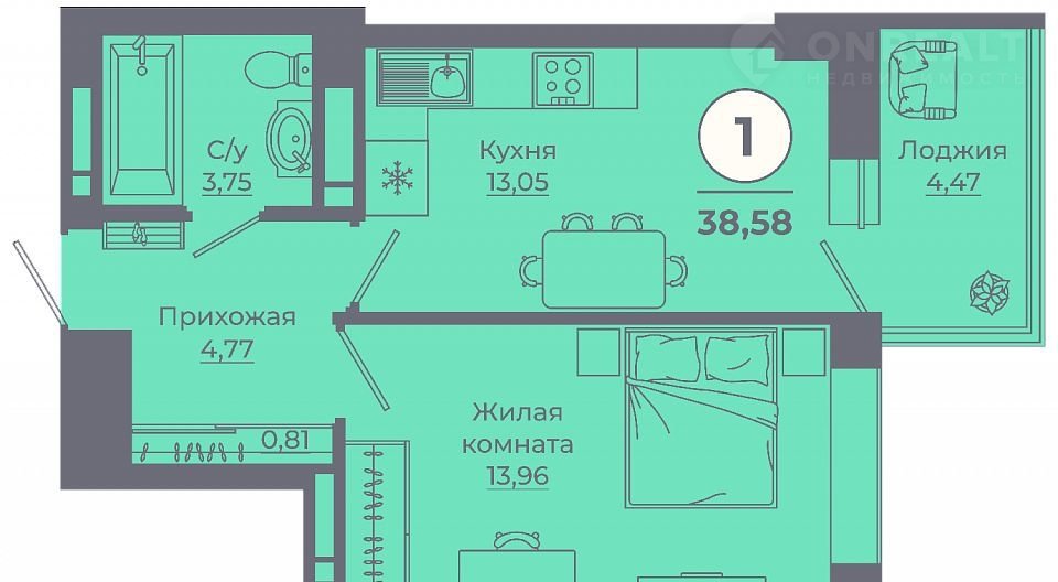 Общая площадь 38.6 м2