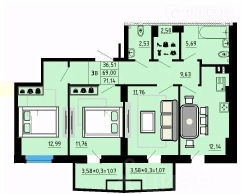 Общая площадь 70.5 м2
