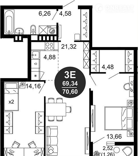 Общая площадь 70.6 м2