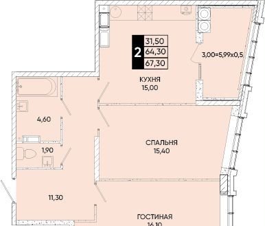 Общая площадь 67.3 м2