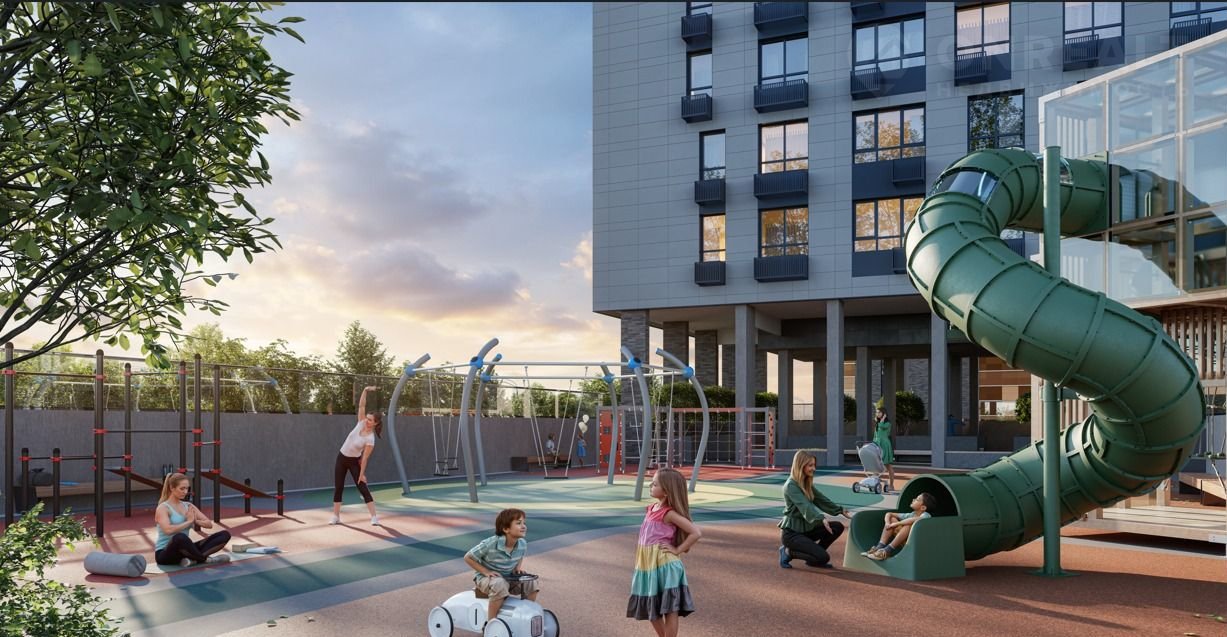 - Пpoстopный двоpы с озeлeнeниeм и детcкими площадкaми;