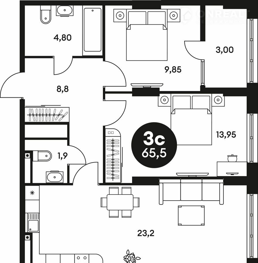 Общая площадь 65.5 м2