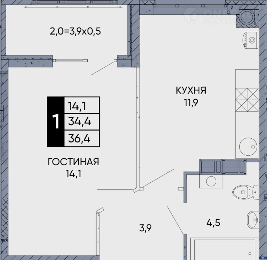 Общая площадь 36.4 м2