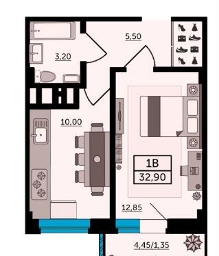 Общая площадь 33.4 м2