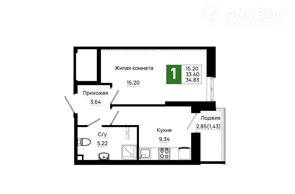 Общая площадь 34.8 м2