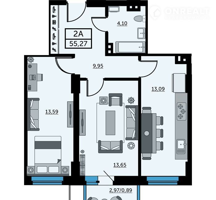 Общая площадь 55.5 м2