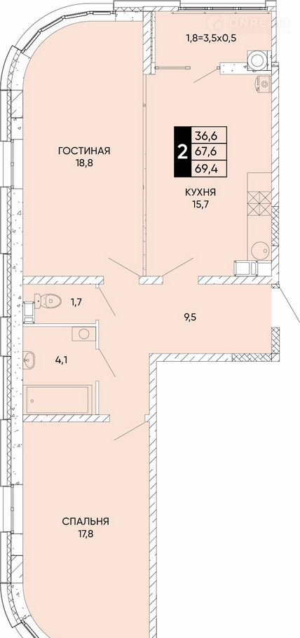 Общая площадь 69.4 м2