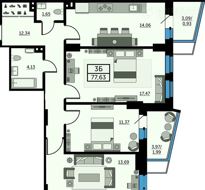 Общая площадь 77.4 м2