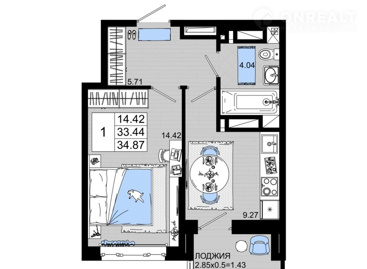 1-комнатная квартира, 34.9 м2, этаж 14 / 25, на продажу в Ростове-на-Дону