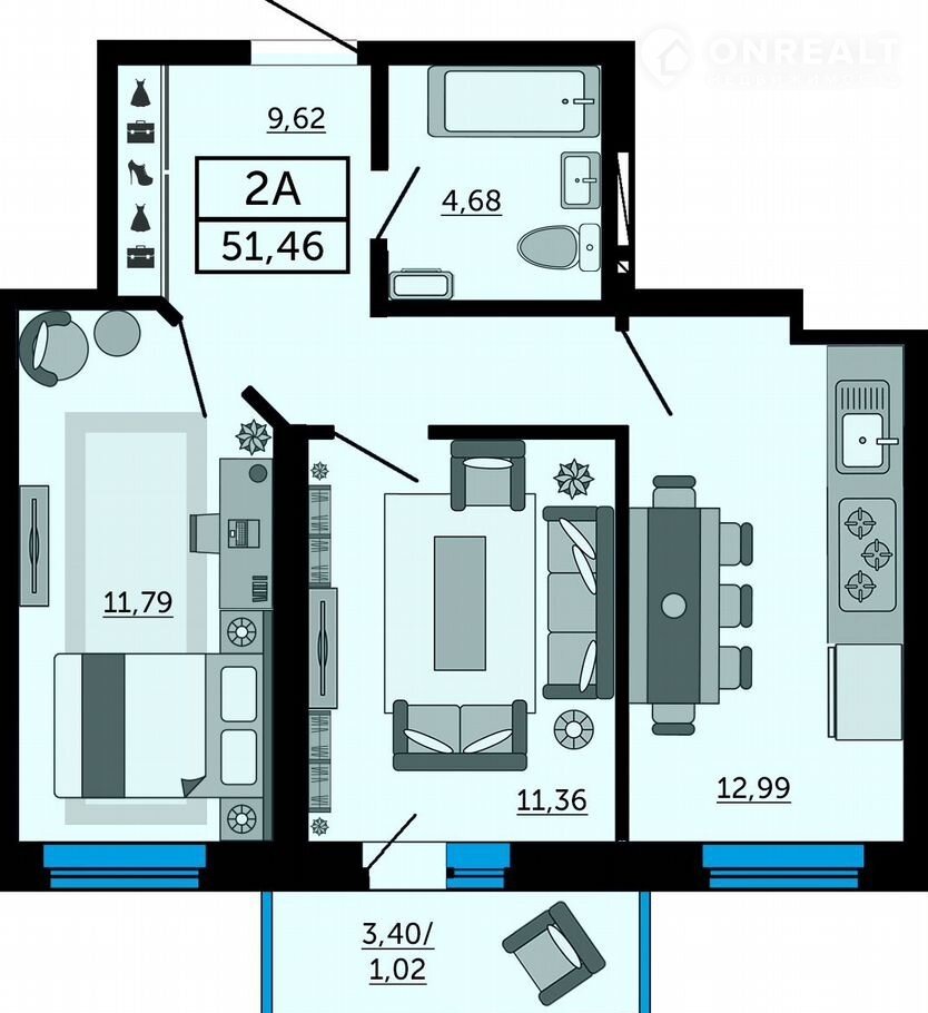 Общая площадь 51.5 м2