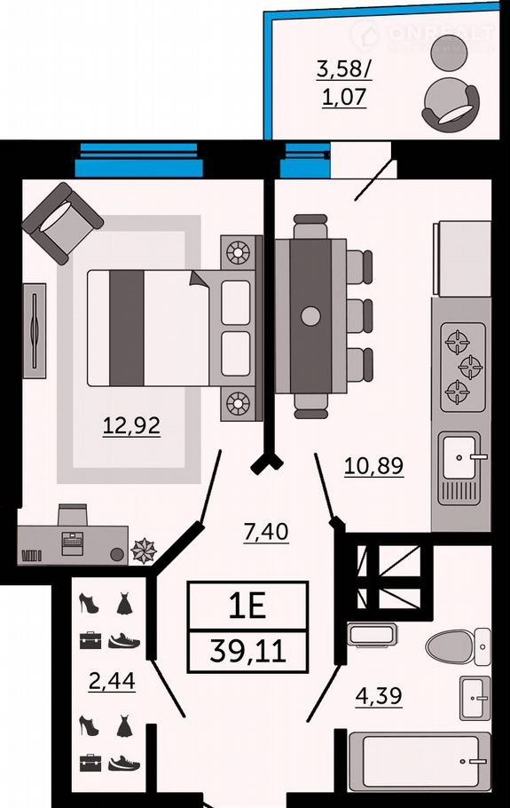 Общая площадь 39.1 м2