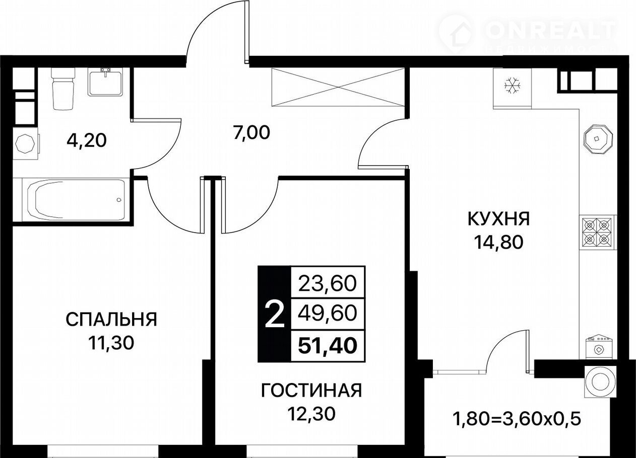Общая площадь 51.4 м2