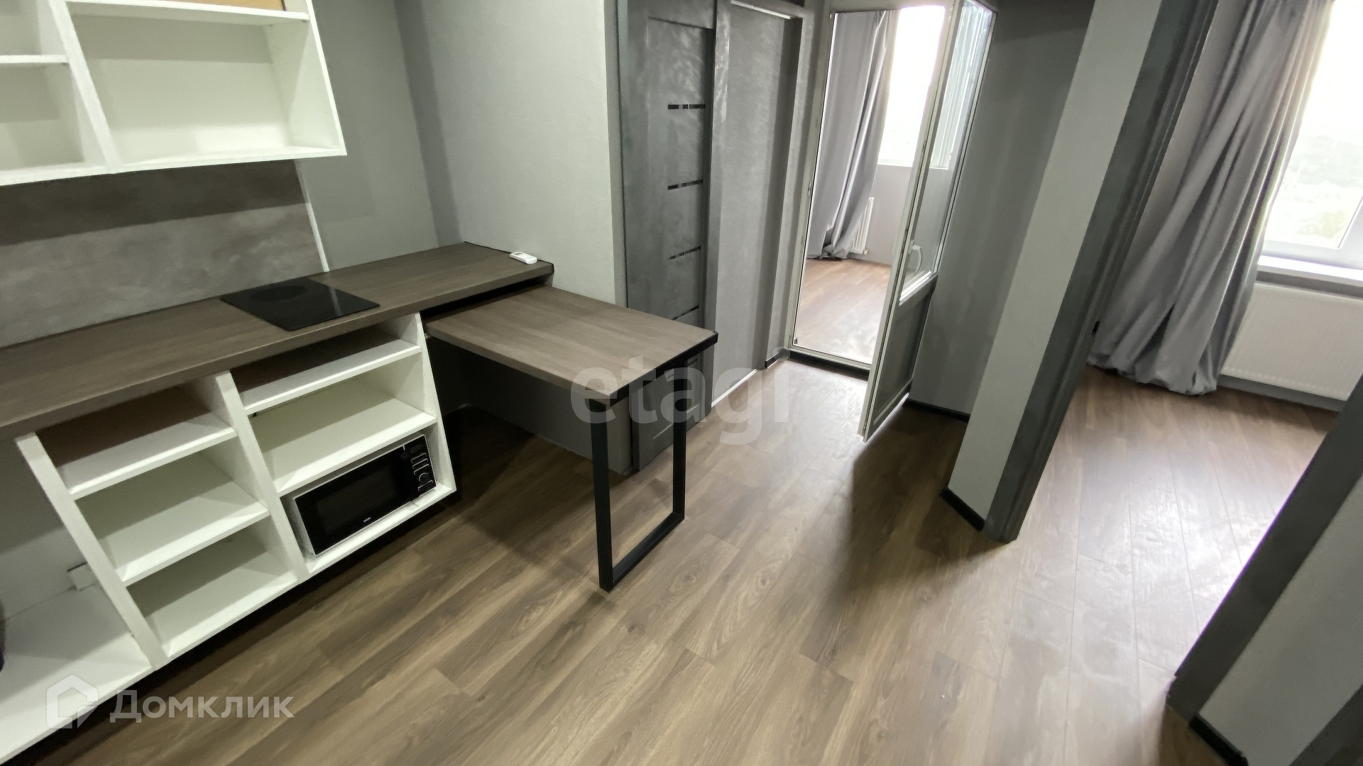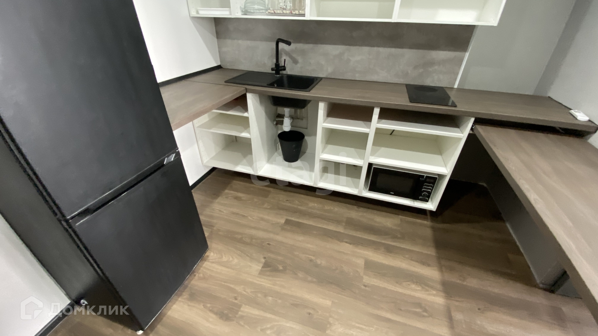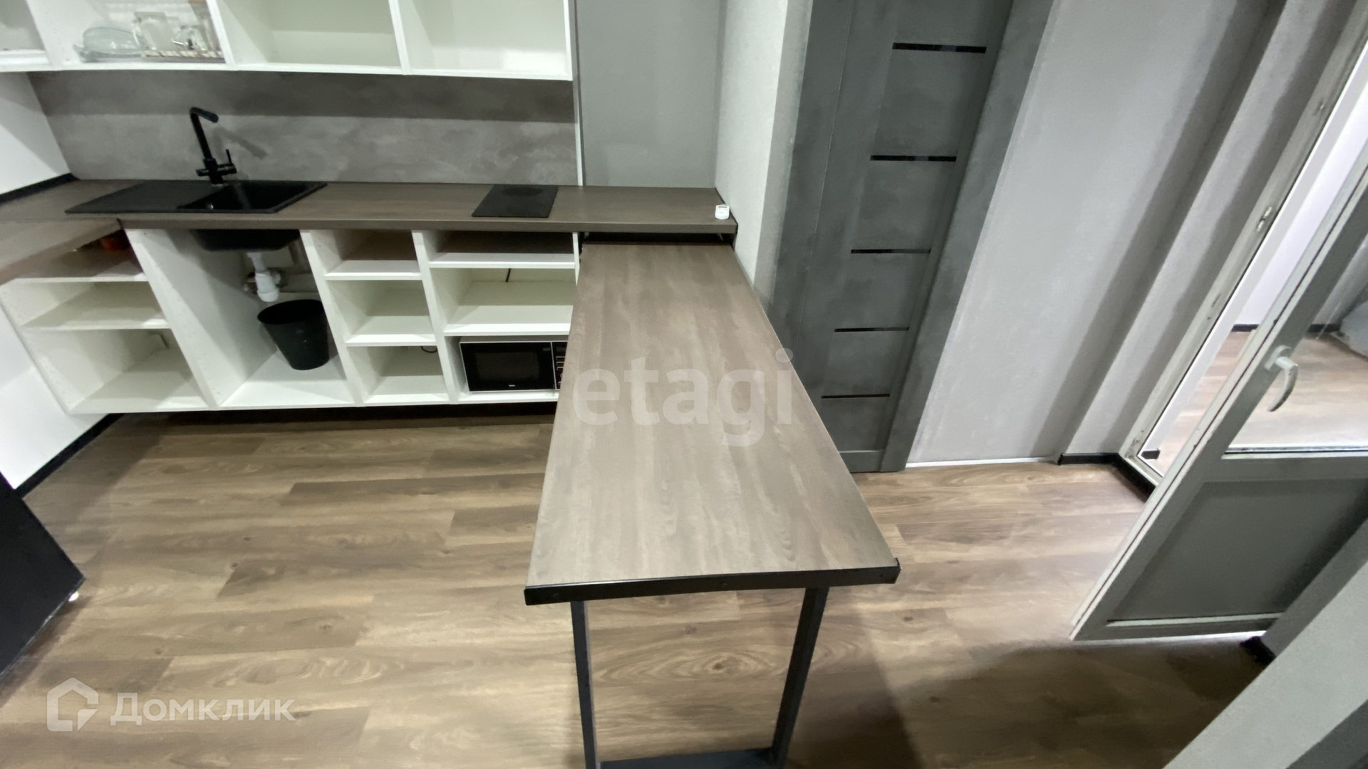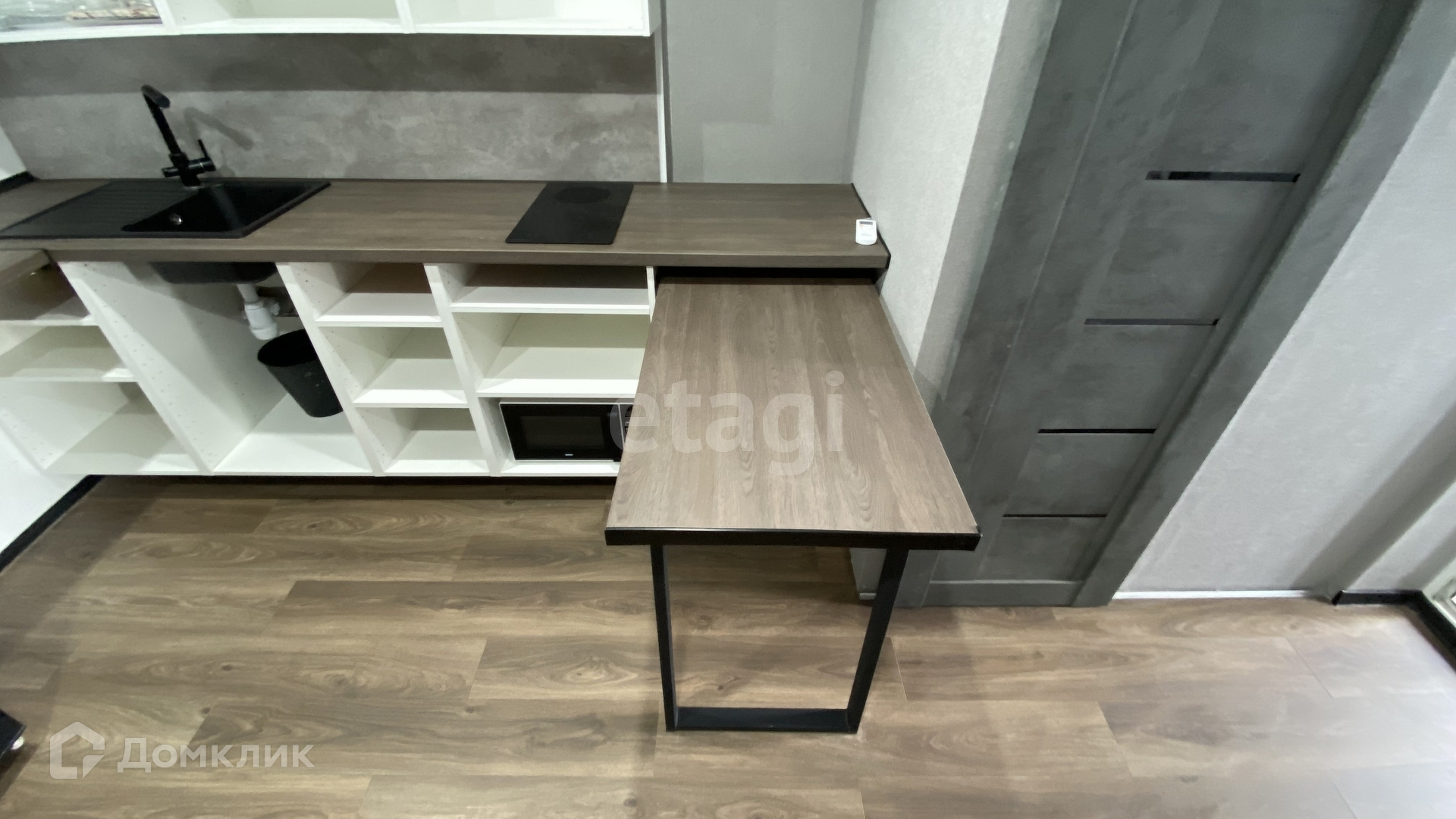 - Кухня. Установлена очень просторная столешница со шкафчиками, раковина, плита, микроволновка, есть много места под духовой шкаф и посудомойку. Выдвижная столешница для бара / еды.